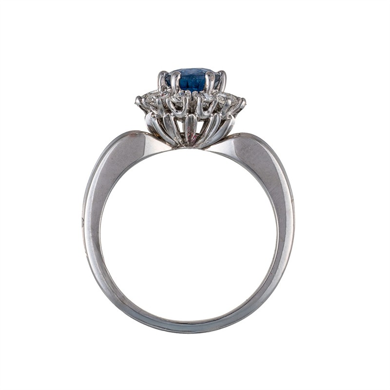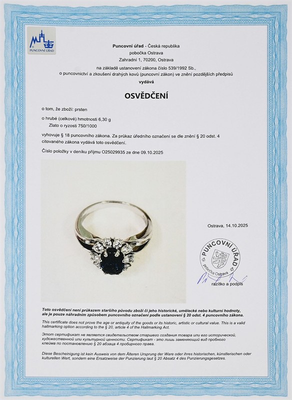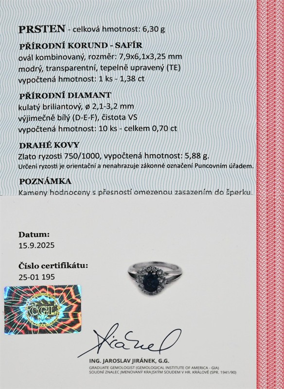 Materiál: bílé zlato o ryzosti 750/1000 Hmotnost: 6,30 g Rozměry: velikost 53,5, míry hlavy 1,2 × 1 cm Drahokamy: 10 ks přírodních diamantů, 0,70 ct celkem, výjimečně bílý (D-E-F), čistota VS, průměr 2,1-3,25 mm, 1 ks přírodní safír, 1,38 ct, tepelně upravený, ovál 7,9x6,1x3,25 mm Stav: výborný Doklady: Osvědčení Puncovního úřadu České republiky Certifikát z gemologické laboratoře je součástí šperku Pro vaše maximální pohodlí nabízíme kompletní zlatnický servis: úpravy velikosti, odborné opravy, rhodiování, výměny kamenů, profesionální čištění, leštění i znalecké odhady. Vše přizpůsobíme vašim přáním.
