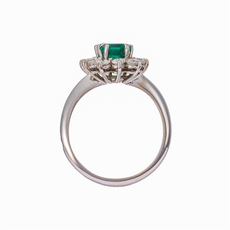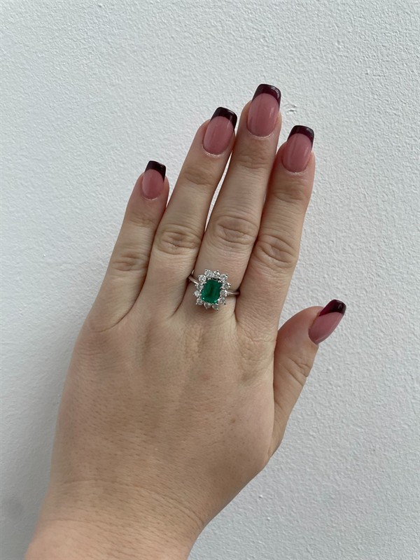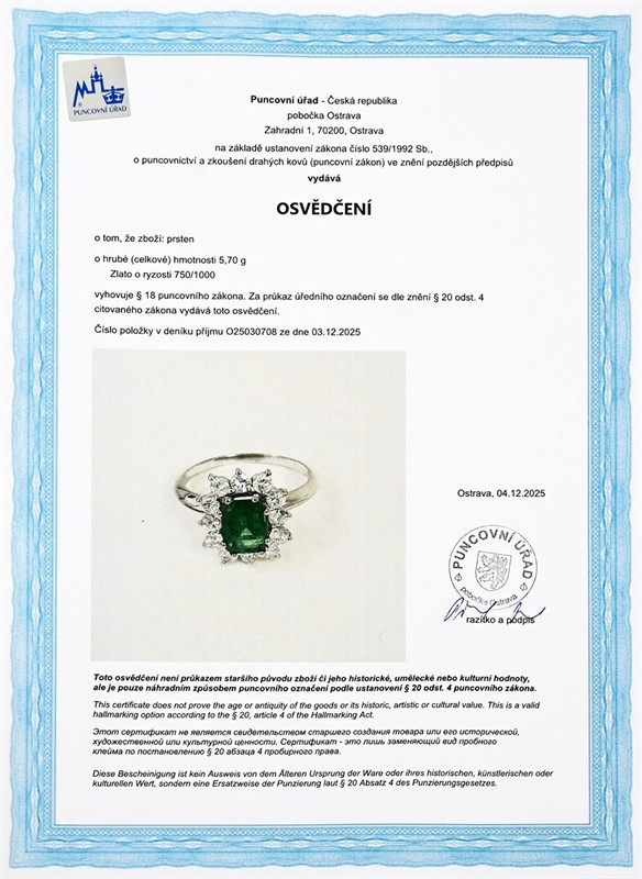 Materiál: bílé zlato o ryzosti 750/1000 Hmotnost: 5,70 g Rozměry: velikost prstenu 59, míry hlavy 1,5x1,2 cm Drahokamy: - 12 ks přírodních kulatých briliantových diamantů, celkem 1,08 ct, výjimečně bílý (D–E–F), čistota (VS) SI1-SI2, průměr 2,8-2,9 mm - 1 ks přírodní smaragd, celkem 2,25 ct, tuporohý obdélník stupňový, zelený, semitransparentní, rozměr 8,65x6,4x5,0 mm Stav: výborný Doklady: Osvědčení Puncovního úřadu České republiky Certifikát z gemologické laboratoře je součástí šperku Pro vaše maximální pohodlí nabízíme kompletní zlatnický servis: úpravy velikosti, odborné opravy, rhodiování, výměny kamenů, profesionální čištění, leštění i znalecké odhady. Vše přizpůsobíme vašim přáním.