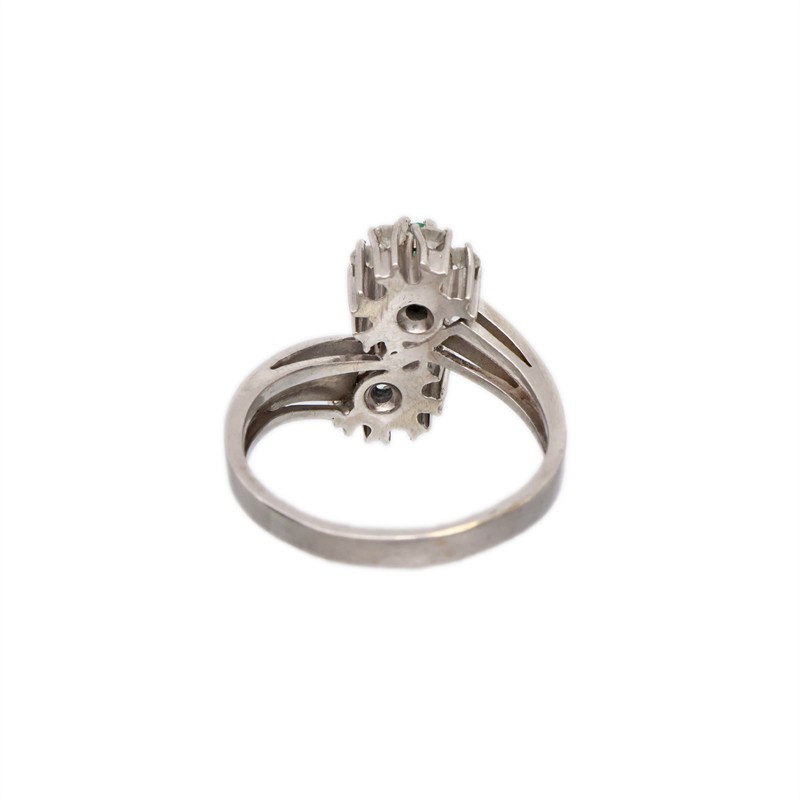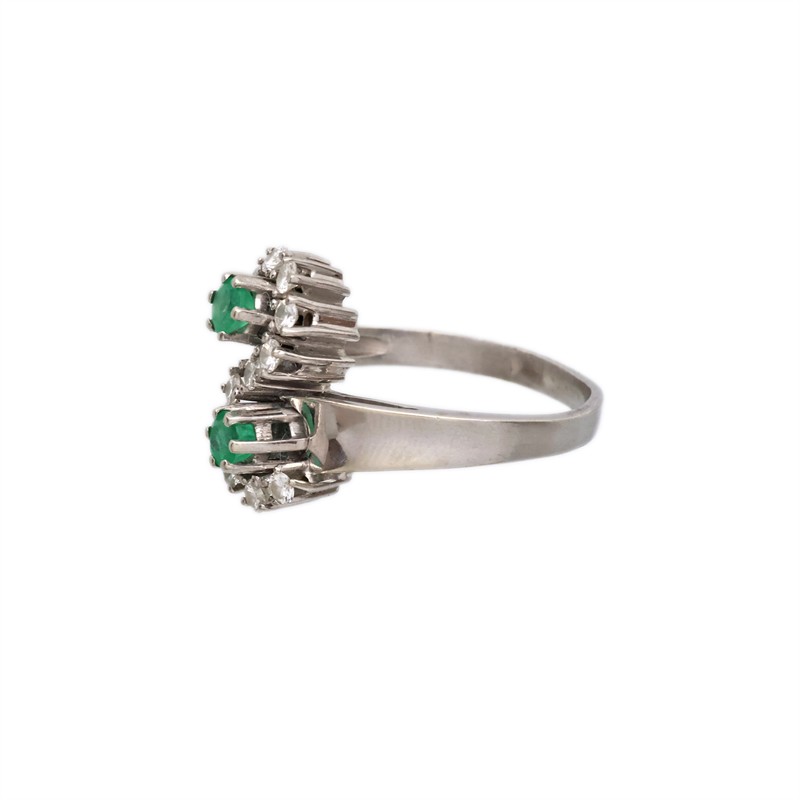14 karátové bílé zlato 585/1000, celková hmotnost 7,07 g | Přírodní smaragdy 0,30 ct | Přírodní diamanty briliantového brusu 0,40 ct | Velikost prstenu 63 (lze upravit) | Velmi dobrý stav | 80.léta | Kameny zkontrolovány v gemologické laboratoři