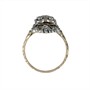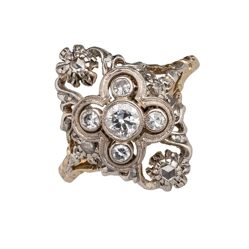 Žluté zlato o ryzosti 580/1000 s částí kamenů uložených ve stříbře váha 4,25 g přírodní diamant Old Europe 1 ks 0,20 ct, vzácně bílý (F-G-H), čistota SI1, přírodní diamant 4 ks 0,12 ct, vzácně bílý (F-G-H), čistota SI1 routy 4 ks 0,04 ct velikost 54 míry hlavy 2 x 1,1 cm výborný stav osvědčení puncovního úřadu certifikát z gemologické laboratoře je součástí šperku