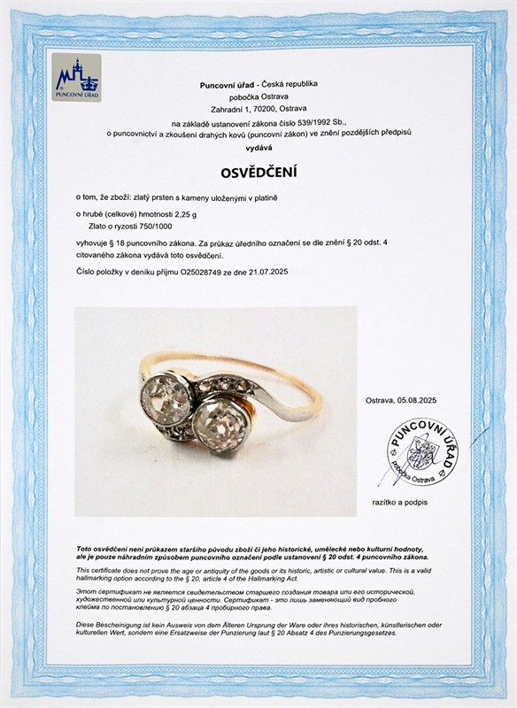 Materiál: žluté zlato o ryzosti 750/1000 Hmotnost: 2,25 g Rozměry: velikost 56, míry hlavy 1,1 × 0,6 cm Drahokamy: 2 ks přírodních diamantů Old Europe, celková hmotnost 0,84 ct, bílý (G–H–I), čistota SI2–I1, průměr 4,8–5,0 mm, 6 ks přírodních diamantů, celková hmotnost 0,04 ct, kulatý briliantový brus, průměr 1,1–1,4 mm Stav: výborný Doklady: Osvědčení Puncovního úřadu České republiky Certifikát z gemologické laboratoře je součástí šperku Pro vaše maximální pohodlí nabízíme kompletní zlatnický servis: úpravy velikosti, odborné opravy, rhodiování, výměny kamenů, profesionální čištění, leštění i znalecké odhady. Vše přizpůsobíme vašim přáním.