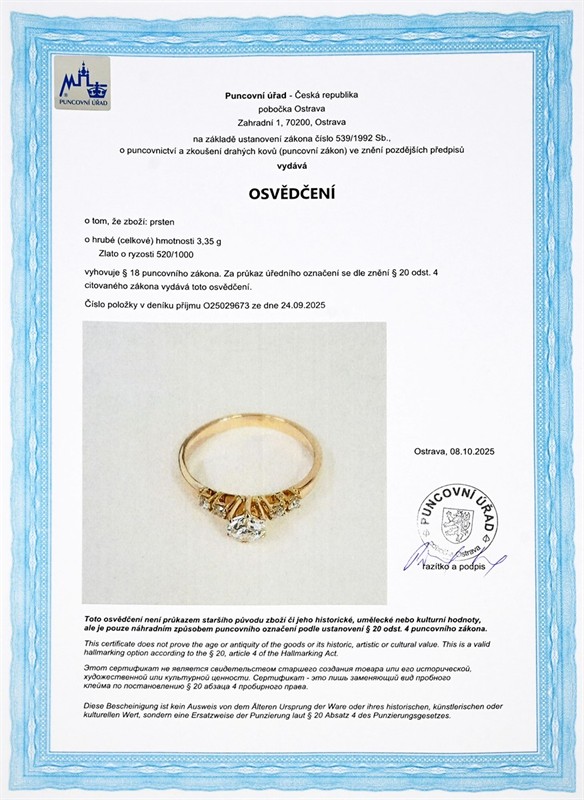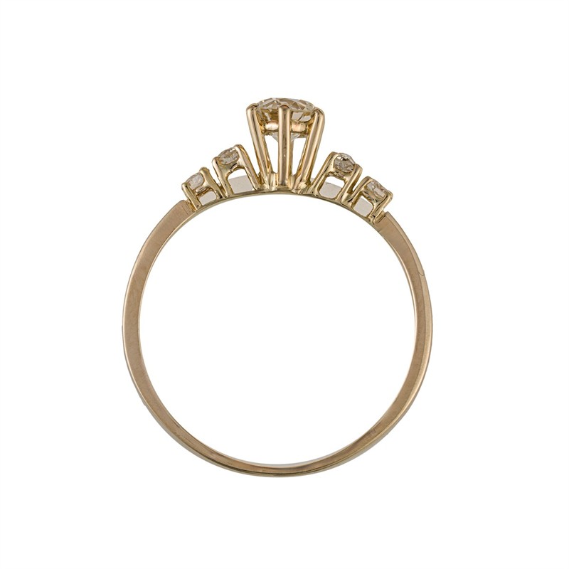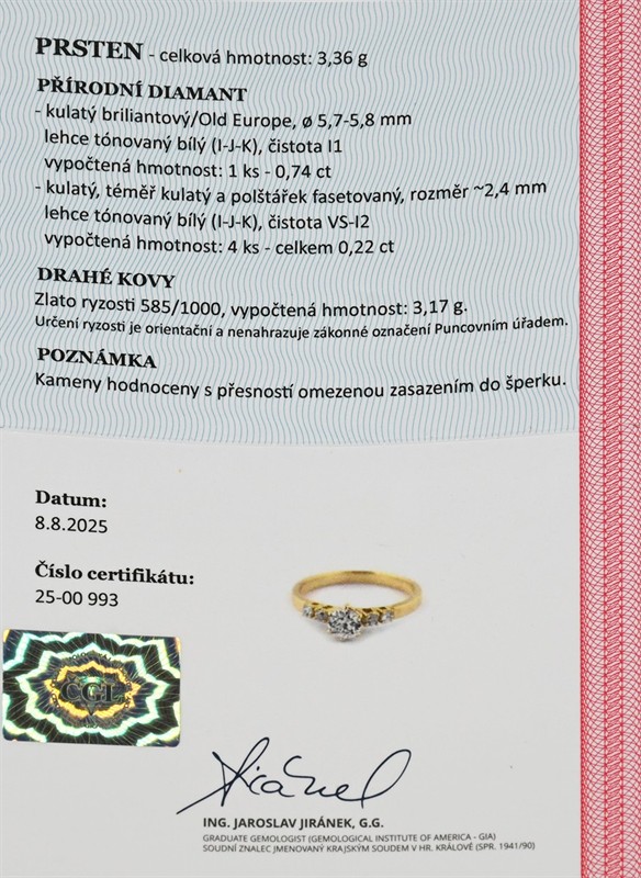 Materiál: žluté zlato o ryzosti 520/1000 Hmotnost: 3,35 g Velikost: 63 Drahokamy: 1 ks přírodní kulatý briliantový diamant Old Europe, 0,74 ct, lehce tónovaně bílý (I–J–K), čistota I1, průměr 5,7–5,8 mm, 4 ks přírodních diamantů, celkem 0,22ct, kulatého a polštářkového fasetového brusu, lehce tónovaně bílé (I–J–K), čistota VS–I2, rozměr 2,4 mm Stav: výborný Doklady: Osvědčení Puncovního úřadu České republiky Certifikát z gemologické laboratoře je součástí šperku Pro vaše maximální pohodlí nabízíme kompletní zlatnický servis: úpravy velikosti, odborné opravy, rhodiování, výměny kamenů, profesionální čištění, leštění i znalecké odhady. Vše přizpůsobíme vašim přáním.