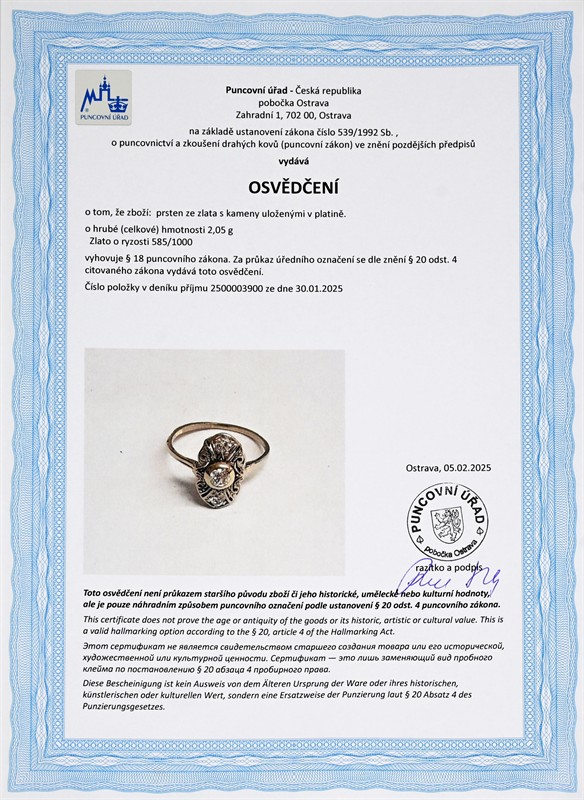 Materiál: bílé zlato o ryzosti 585/1000 Hmotnost: 2,05 g Rozměry: velikost prstenu 54, míry hlavy 1,5 x 0,9 cm Drahokamy: • 9 ks přírodních diamantů, celková hmotnost cca 0,40 ct Stav: výborný Datace: kolem roku 1930, stará práce Doklady: • osvědčení Puncovního úřadu České republiky Drahokamy s garancí pravosti, zkontrolované v gemologické laboratoři Pro vaše maximální pohodlí nabízíme kompletní zlatnický servis: úpravy velikosti, odborné opravy, rhodiování, výměny kamenů, profesionální čištění, leštění i znalecké odhady. Vše přizpůsobíme vašim přáním.