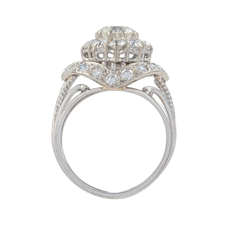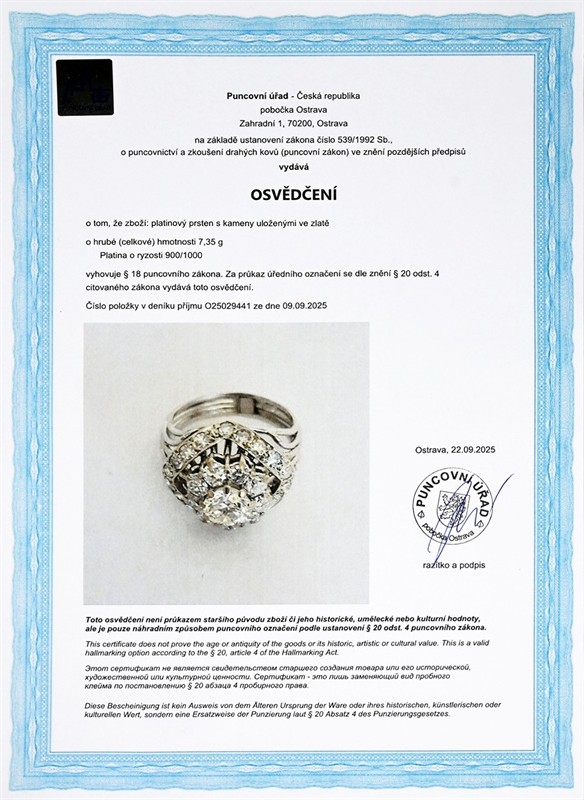 Platina o ryzosti 900/1000 váha 7,35 g | přírodní diamant 1 ks 0,85 ct, lehce tónovaný bílý (I-J-K), čistota SI1 přírodní diamanty 9 ks 0,85 ct, bílý (G-H-I), čistota SI1-SI2-I1 přírodní diamanty 18 ks 0,65 ct, bílý (G-H-I), čistota VS-SI1 (-SI2) velikost 54 míry hlavy 1,7 x 1,4 cm, výška hlavy 0,9 cm výborný stav osvědčení puncovního úřadu certifikát z gemologické laboratoře je součástí šperku