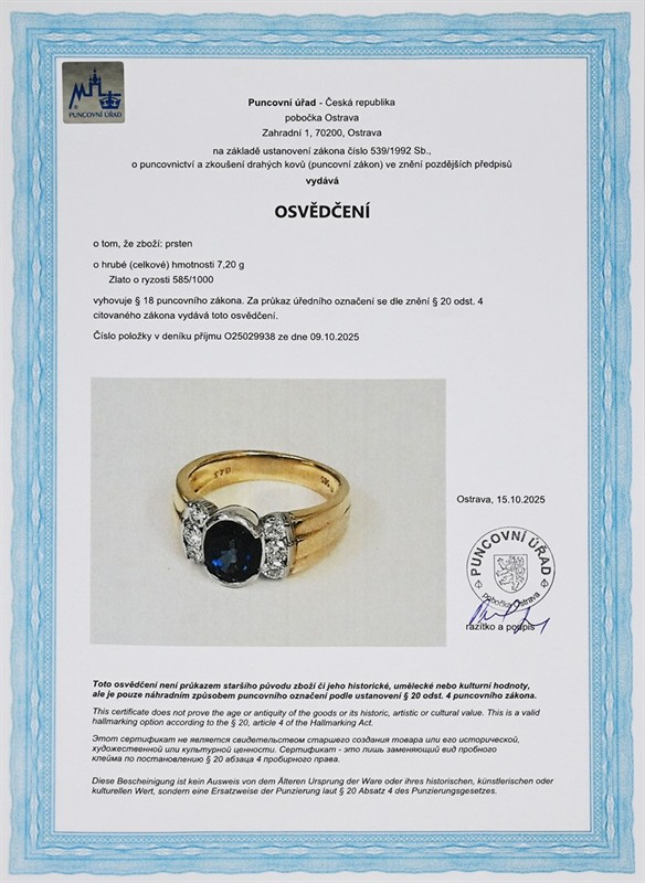 Materiál: žluté zlato o ryzosti 585/1000 Hmotnost: 7,20 g Rozměry: velikost 50,5, míry hlavy 0,9x1,2 cm Drahokamy. 6 ks přírodních diamantů, průměr 2,7 mm, 1 ks přírodní safír, ovál 8,3x6,2x4,55 mm Stav: výborný Doklady: Osvědčení Puncovního úřadu České republiky Drahokamy s garanci pravosti, zkontrolované v gemologické laboratoři. Pro vaše maximální pohodlí nabízíme kompletní zlatnický servis: úpravy velikosti, odborné opravy, rhodiování, výměny kamenů, profesionální čištění, leštění i znalecké odhady. Vše přizpůsobíme vašim přáním.