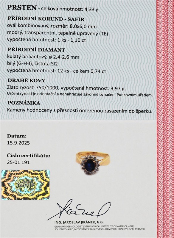Materiál: žluté zlato o ryzosti 750/1000 Hmotnost: 3,68 g Rozměry: velikost 60, míry hlavy 1,3x1,1 cm Drahokamy: 12 ks přírodních diamantů, 0,74 ct celkem, bílý (G-H-I), čistota SI2, průměr 2,40–2,60 mm 1 ks přírodní safír, 1,10 ct celkem, ovál 8,0x6,0 mm Stav: výborný Doklady: Osvědčení Puncovního úřadu České republiky Certifikát z gemologické laboratoře je součástí šperku Pro vaše maximální pohodlí nabízíme kompletní zlatnický servis: úpravy velikosti, odborné opravy, rhodiování, výměny kamenů, profesionální čištění, leštění i znalecké odhady. Vše přizpůsobíme vašim přáním.