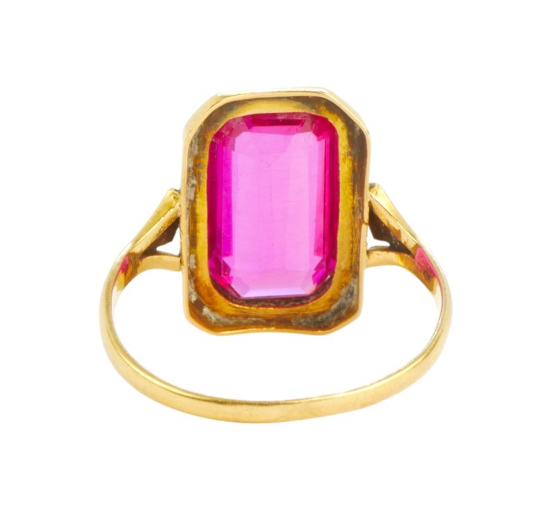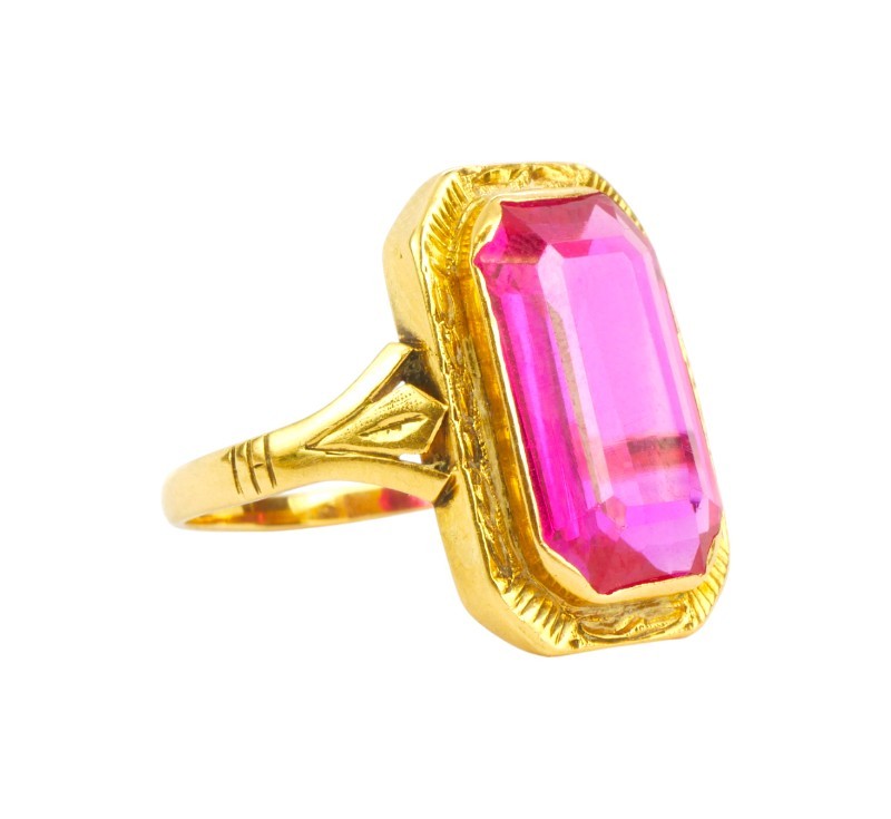 Starožitný prsten z počátku 20. století ze žlutého zlata ryzosti 585/1000 je osazen syntetickým rubínem. Punc liška. Velikost prstenu 66. Celková hmotnost prstenu je 4,09 g.