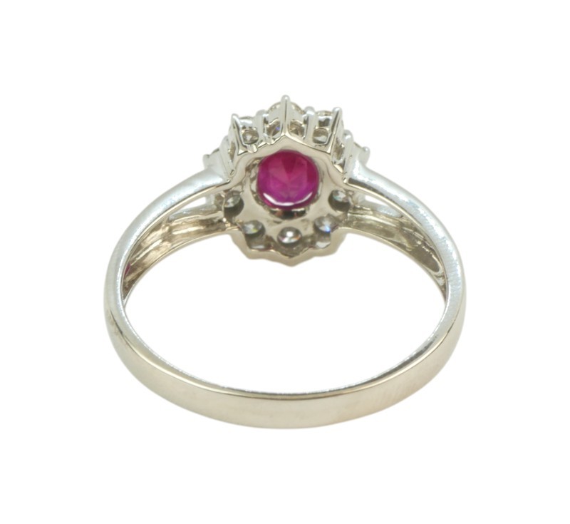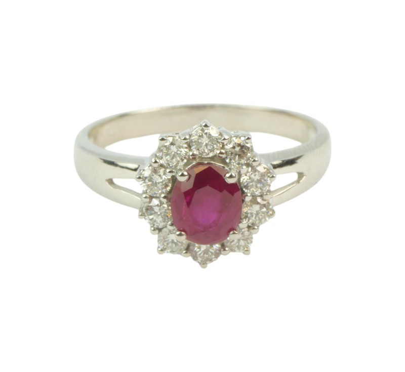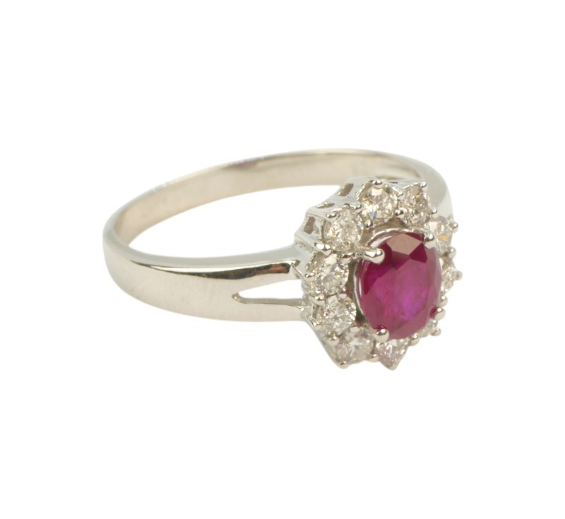 Prsten z bílého zlata ryzosti 585/1000 osazený nádherným přírodním rubínem o hmotnosti 0,90 ct a diamanty briliantového brusu o celkové hmotnosti 0,45 ct. Celková hmotnost prstenu je 2,70 g. Velikost 56.