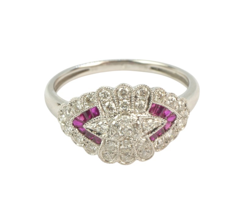 půvabný prsten v art deco tvarosloví z bílého zlata ryzosti 585/1000 osazený přírodními rubíny o celkové hmotnosti 0,10 ct a diamanty briliantového brusu o celkové hmotnosti 0,45 ct (SI-PI/H). Celková hmotnost prstenu je 2,80 g. Velikost 56.