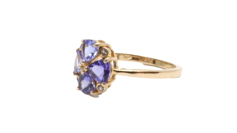 Zlatý prsten s tanzanity a topazy. Žluté zlato 375/1000. Přírodní tanzanity, celková váha 1,25 ct. Přírodní topazy, celková váha 0,03 ct. Váha prstenu: 2,11 g. Velikost prstenu: 52.