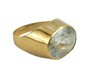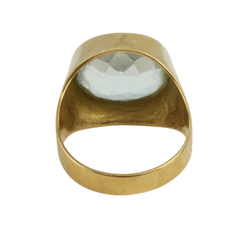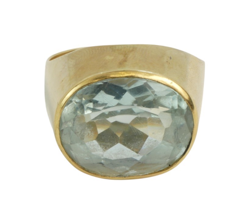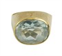 Výrazný designový prsten prsten ze žlutého zlata ryzosti 585/1000/1000 s velkým oválným topazem světlemodré barvy. Celková hmotnost prstenu je 8,16 g. Velikost 60.