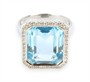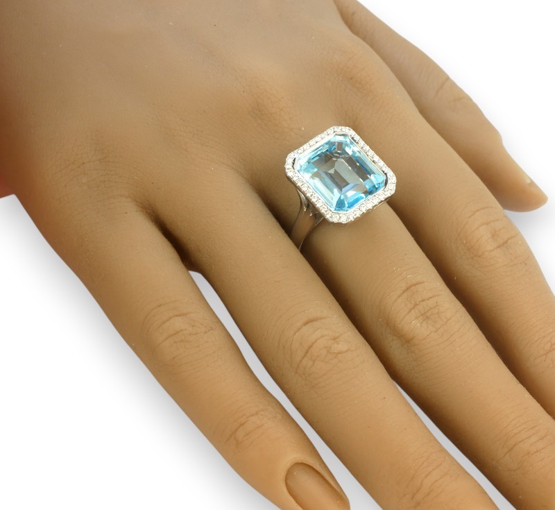 Prsten z bílého zlata ryzosti 585/1000 osazený velkým přírodním topazem o hmotnosti 9,52 ct a diamanty briliantového brusu o celkové hmotnosti 0,30 ct (SI-PI/H). Celková hmotnost prstenu je 6,89 g. Velikost 57.