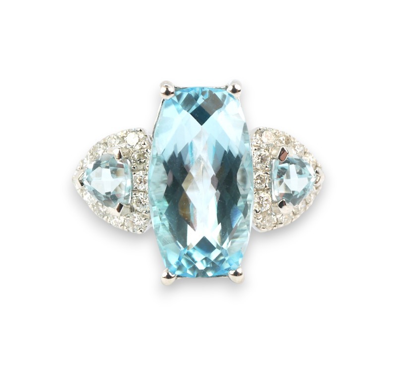 Prsten z bílého zlata ryzosti 585/1000 osazený topazy o celkové hmotnosti 4,00 ct a diamanty briliantového brusu o celkové hmotnosti 0,30 ct (PI/H). Celková hmotnost prstenu je 3,15 g. Velikost 56.