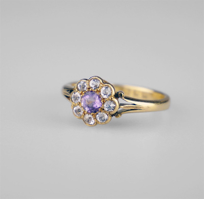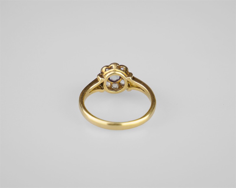 Zlatý prsten s s turmalínem a 8 diamanty briliantového brusu, celkem 0,38 ct, barva H, kvalita VS1, turmalín 0,10 ct. Celková hmotnost Au 3,50 g/750/1000, punc. Velká Británie, první čtvrtina 20. století, velikost prstenu 53.