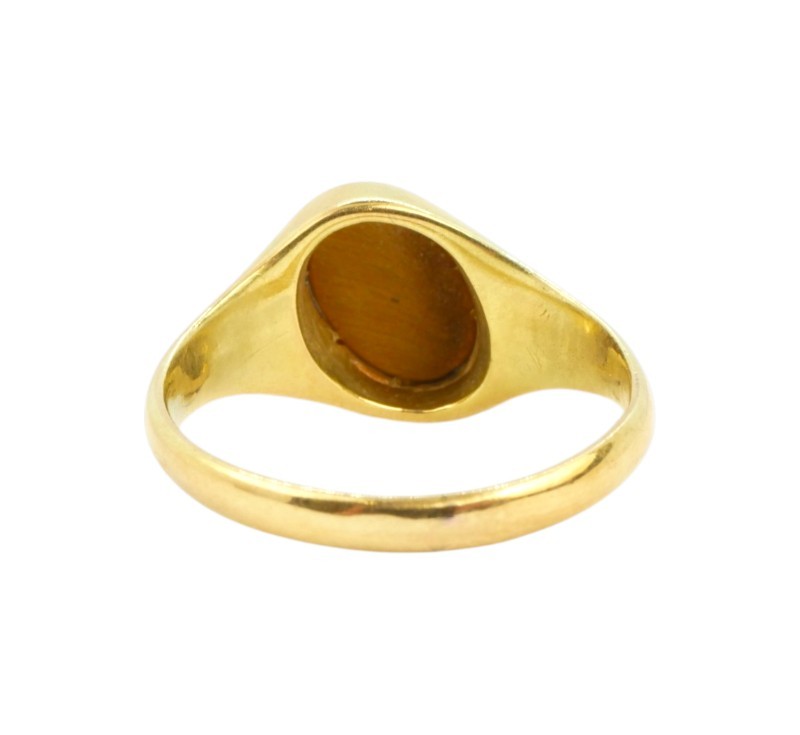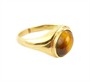 Prvorepublikový prsten vyrobený ze zlata ryzosti 585/1000 (punc liška) zdobený tygřím okem které má vybroušený hladký, oválný tvar typu kabošon. Kámen je známý svým efektem kočičího oka (chatoyancy), kdy se na světle mění hnědé a zlatavé pruhy. Velikost 55. Hmotnost 4,07 g.