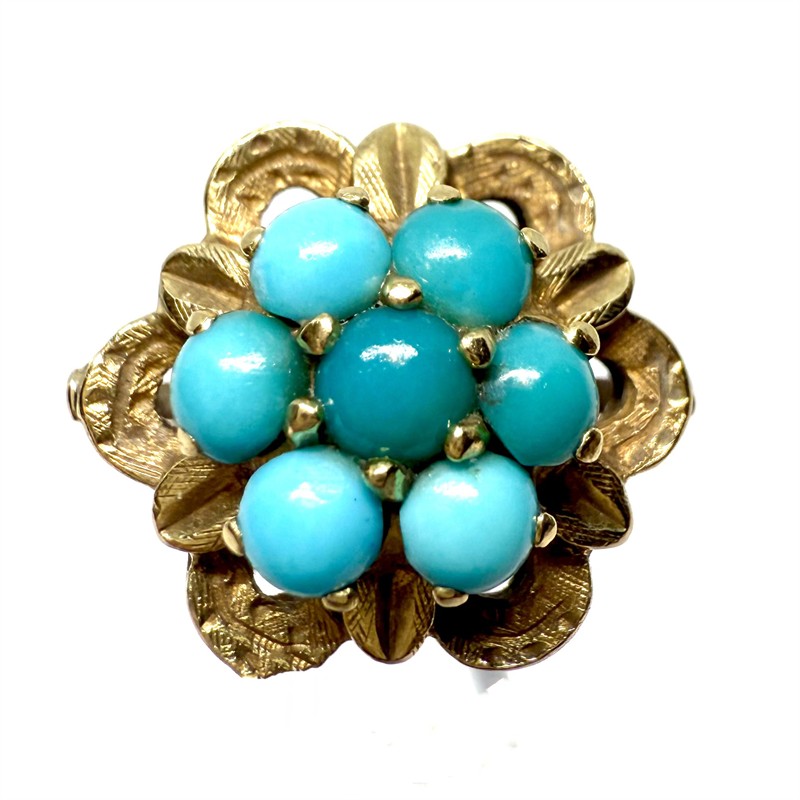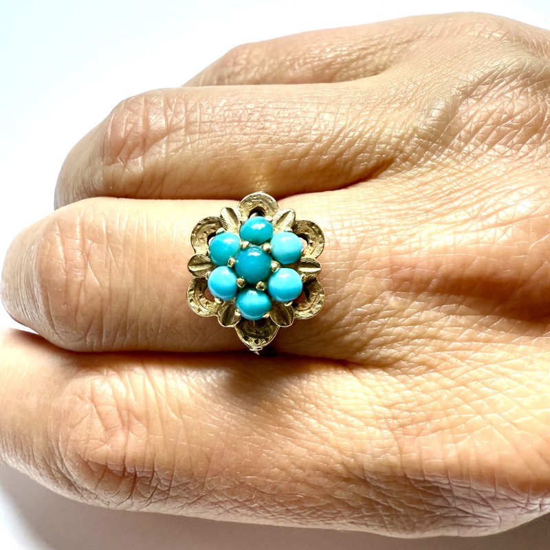 Malebný prsten z 18ti karátového zlata (Au 750/1000). Prsten zdobí sedm přírodních tyrkysů seskupených pomocí krapen do tvaru květu. Zlaté okvětní lístky zdobeny ručním gravírováním. Celková váha 3,66 g . Velikost 53. Perfektní stav.