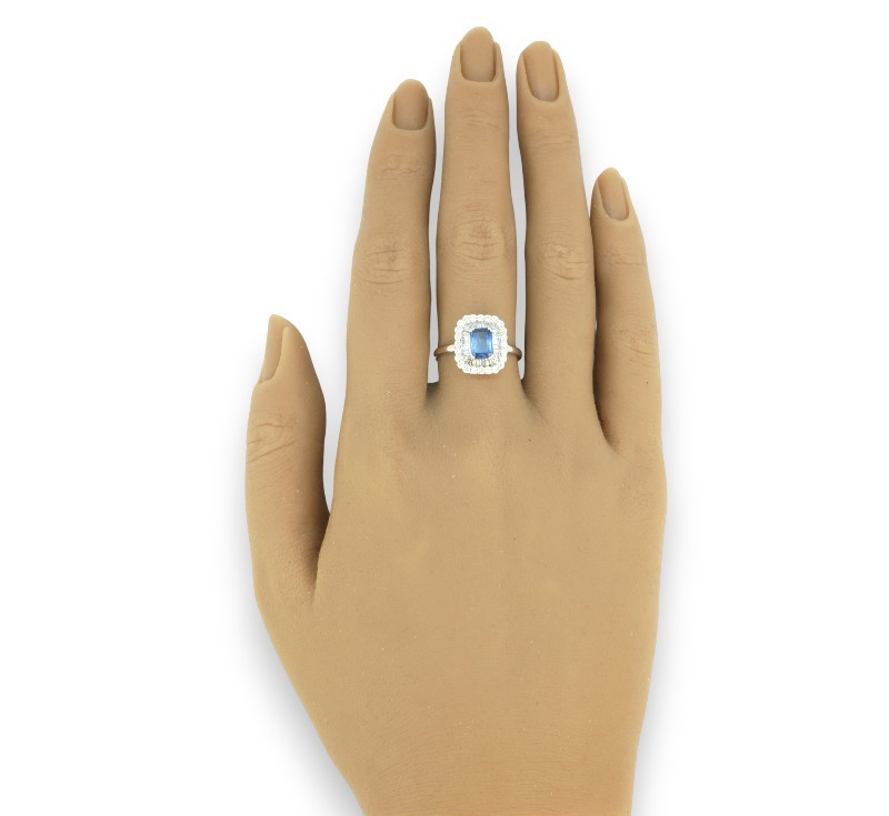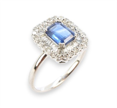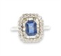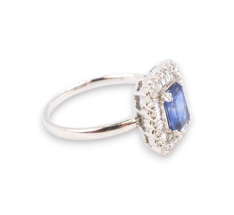 Prsten z bílého zlata ryzosti 585/1000 s přírodním středně modrým safírem o celkové hmotnosti 1 ct a diamanty briliantového a bagetového brusu o celkové hmotnosti 0,5 ct. Celková hmotnost prstenu je 3,02 g. Velikost 56.