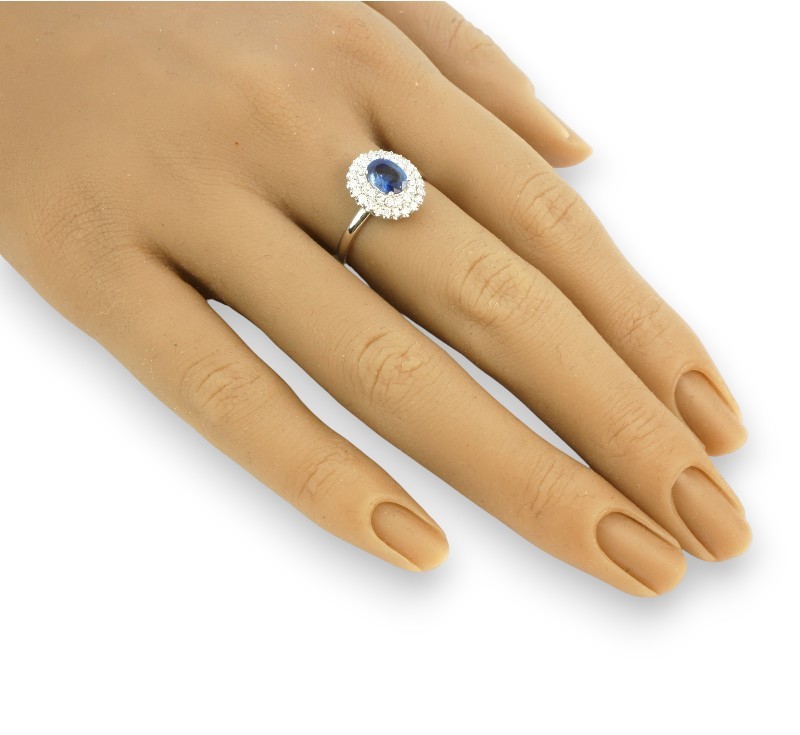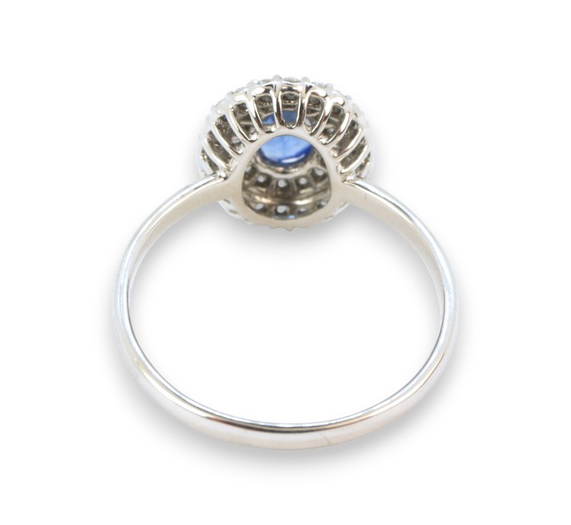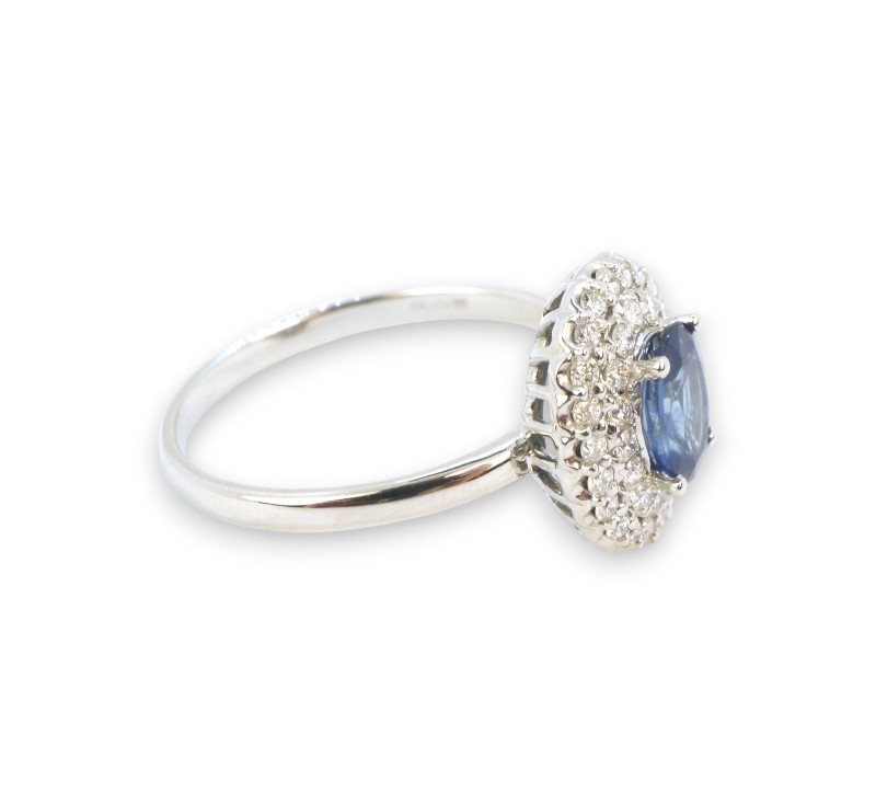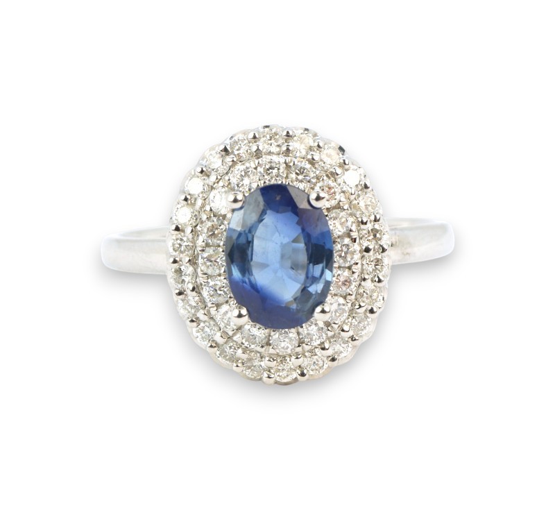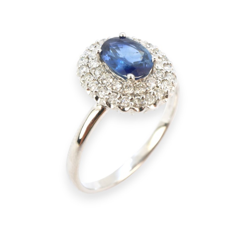 Prsten z bílého zlata ryzosti 585/1000 s přírodním safírem o celkové hmotnosti 0,70 ct a diamanty briliantového brusu o celkové hmotnosti 0,40 ct. Celková hmotnost prstenu je 2,88 g. Velikost 57.