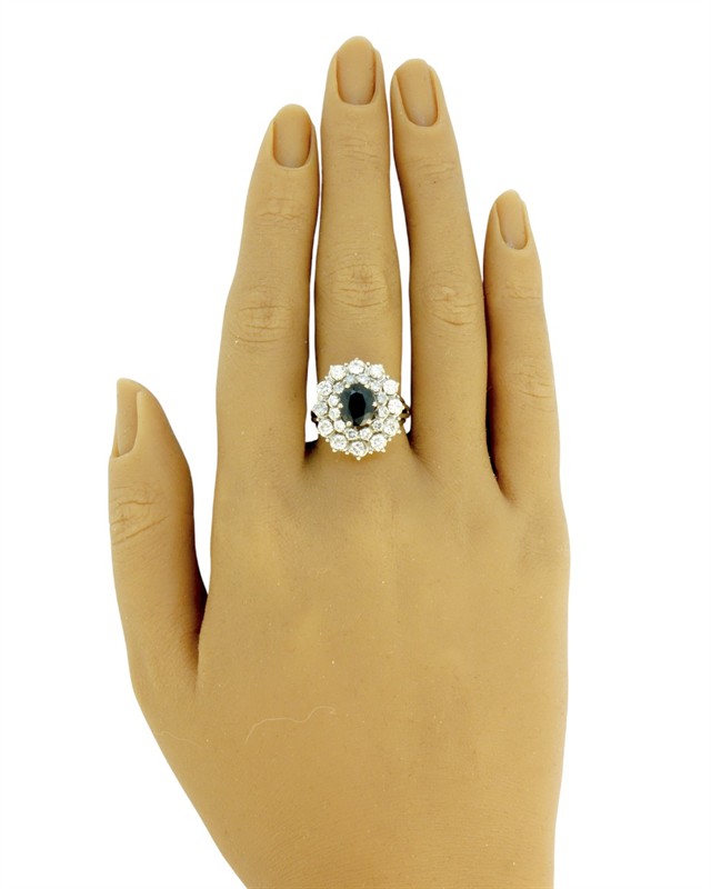 Nepřehlédnutelný luxusní prsten z bílého zlata ryzosti 750/1000 zdobený safírem a diamanty brilantového brusu celkové hmotnosti 1,80 ct. Celková hmotnost prstenu je 8,0 g. Velikost 54-55.