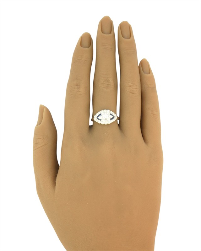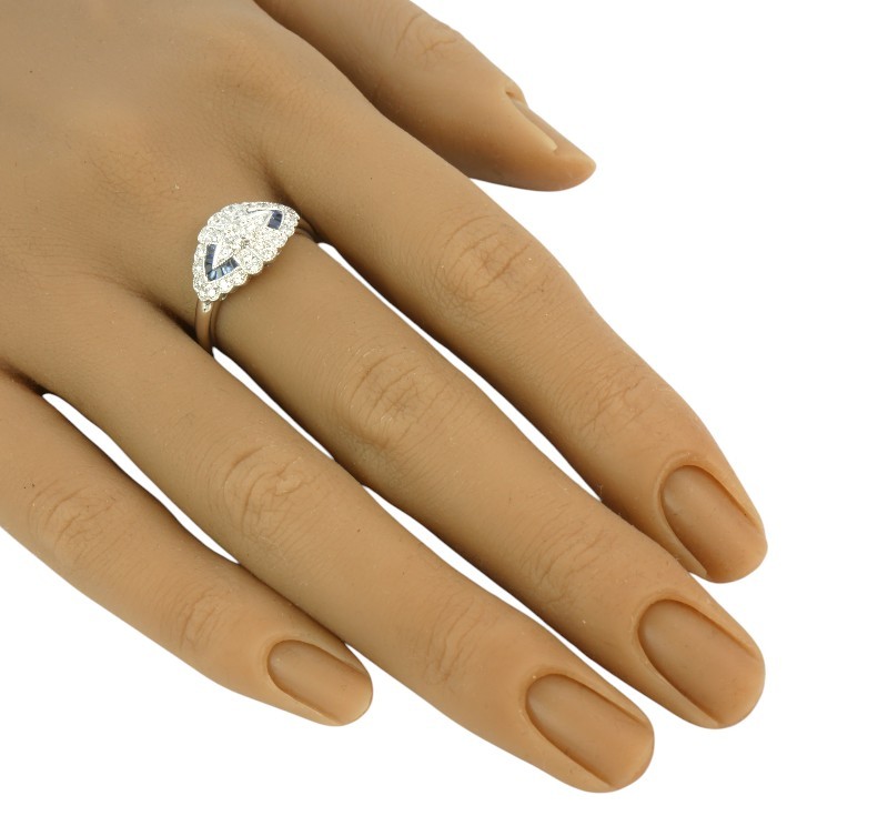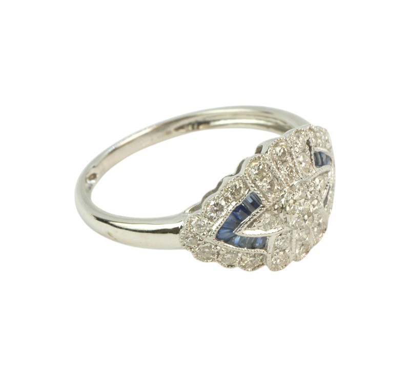 Prsten v art deco tvarosloví z bílého zlata ryzosti 585/1000 osazený přírodními safíry o celkové hmotnosti 0,10 ct a diamanty briliantového brusu o celkové hmotnosti 0,45 ct (SI-PI/H). Celková hmotnost prstenu je 2,80 g. Velikost 56.