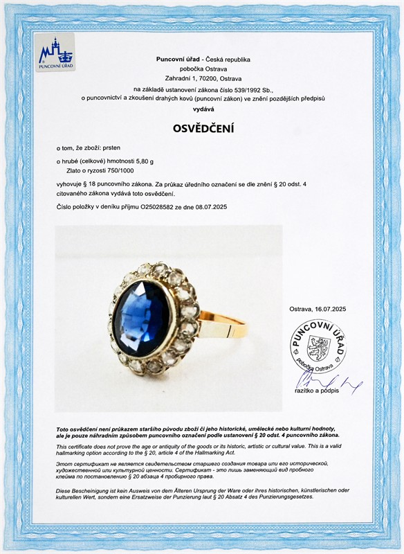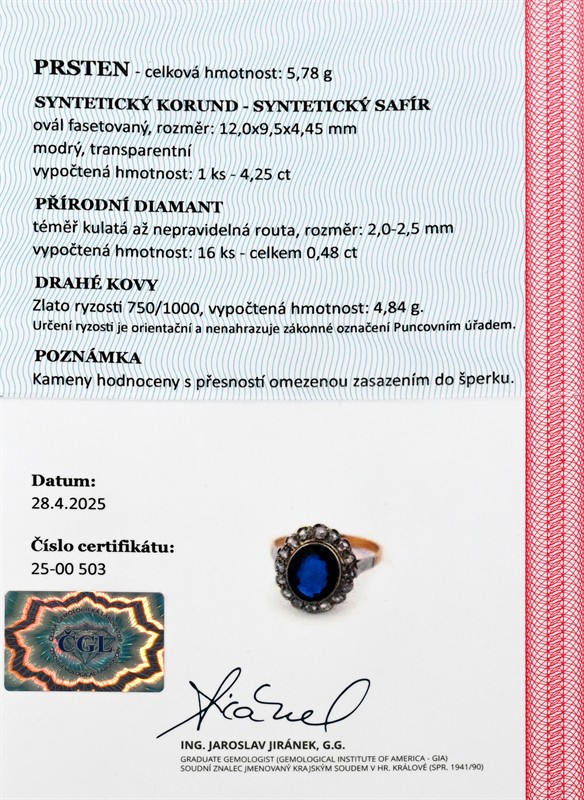 zlato o ryzosti 750/1000 váha 5,7 g míry hlavy 1,8 x 1,4 cm syntetický safír 4,25 ct přírodní diamanty až nepravidelná routa 16 ks - 0,48 ct velikost 66 výborný stav osvědčení puncovního úřadu certifikát z gemologické laboratoře je součástí šperku