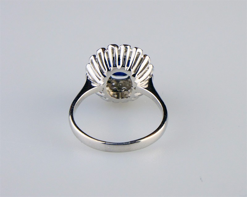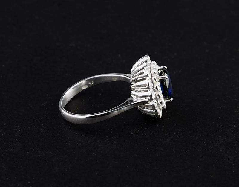Zlatý prsten s přírodním safírem a diamanty briliantového brusu, safír o hmotnosti 1,25 ct, 32 kusů diamantů cca 0,50 ct. Celková hmotnost Au 4,23 g/750/1000, punc. Západní Evropa, začátek 21. století, velikost prstenu 53.