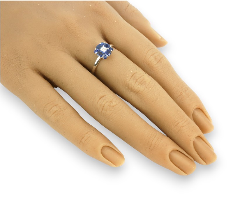 Prsten z bílého zlata ryzosti 585/1000 se safíry o celkové hmotnosti 0,80 ct a diamantem briliantového brusu o hmotnosti 0,07 ct (SI-PI/H). Celková hmotnost prstenu je 2,04 g. Velikost 56.