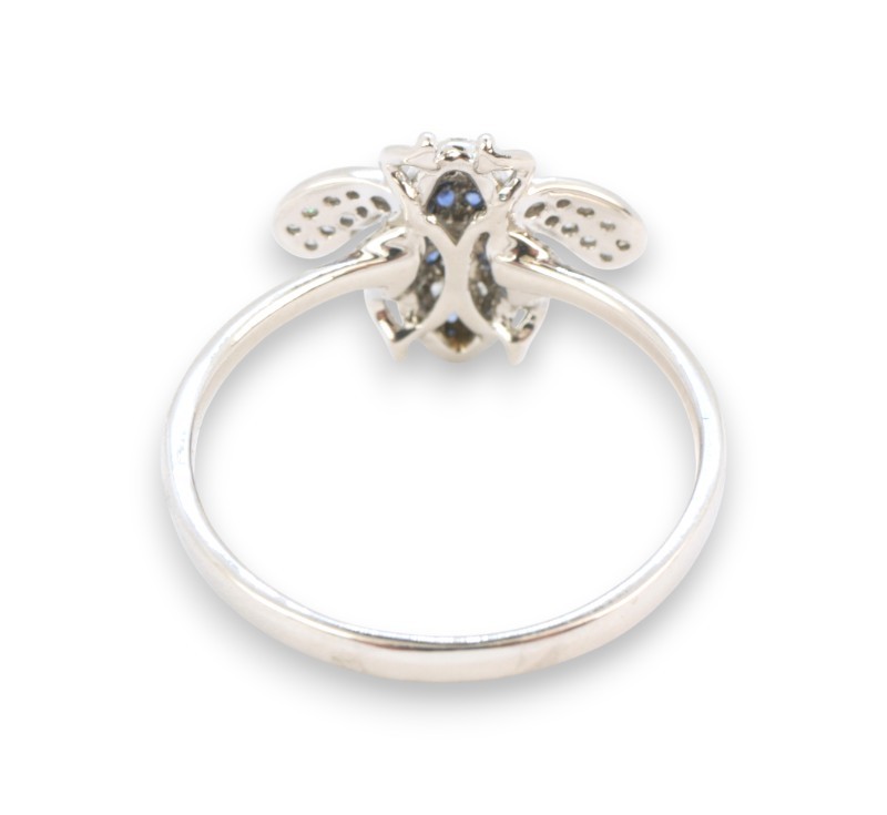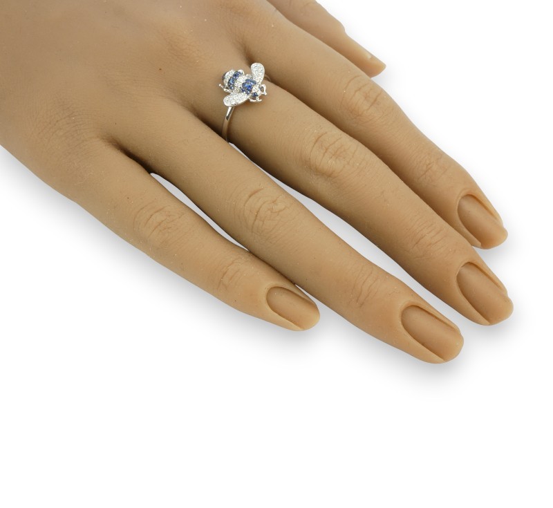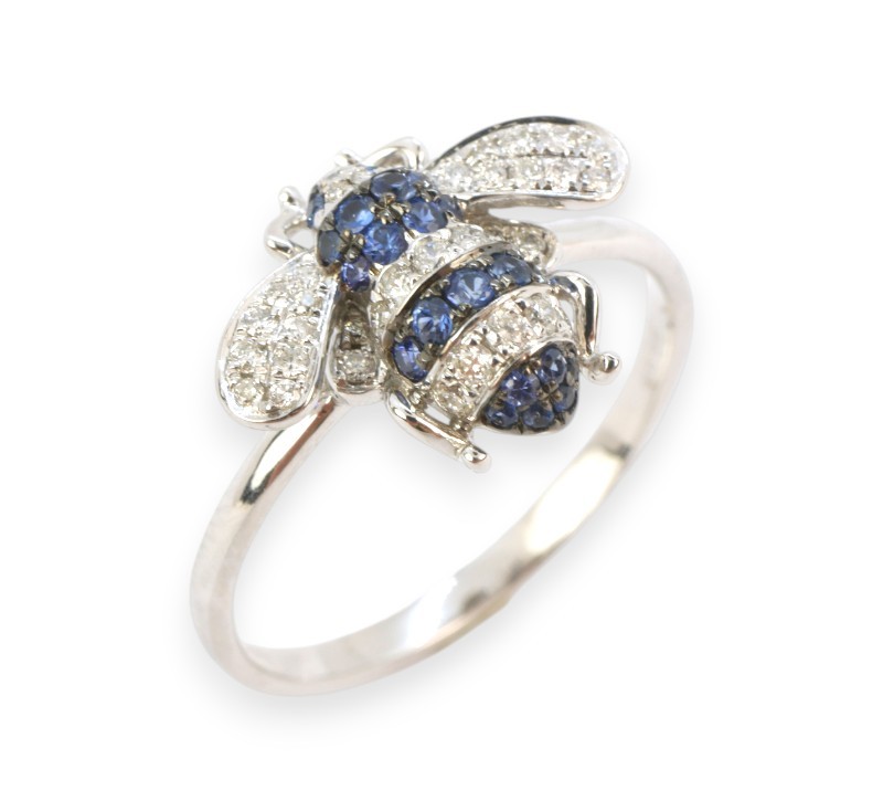 Prsten z bílého zlata ryzosti 585/1000 ve tvaru včely se safíry o celkové hmotnosti 0,10 ct a diamanty briliantového brusu o celkové hmotnosti 0,15 ct. Celková hmotnost prstenu je 2,22 g. Velikost 56.