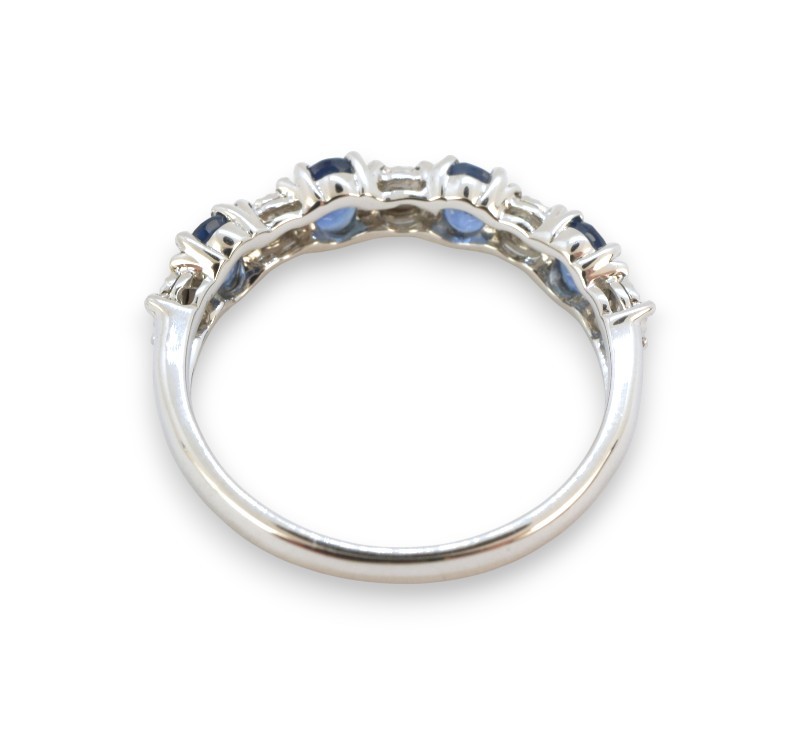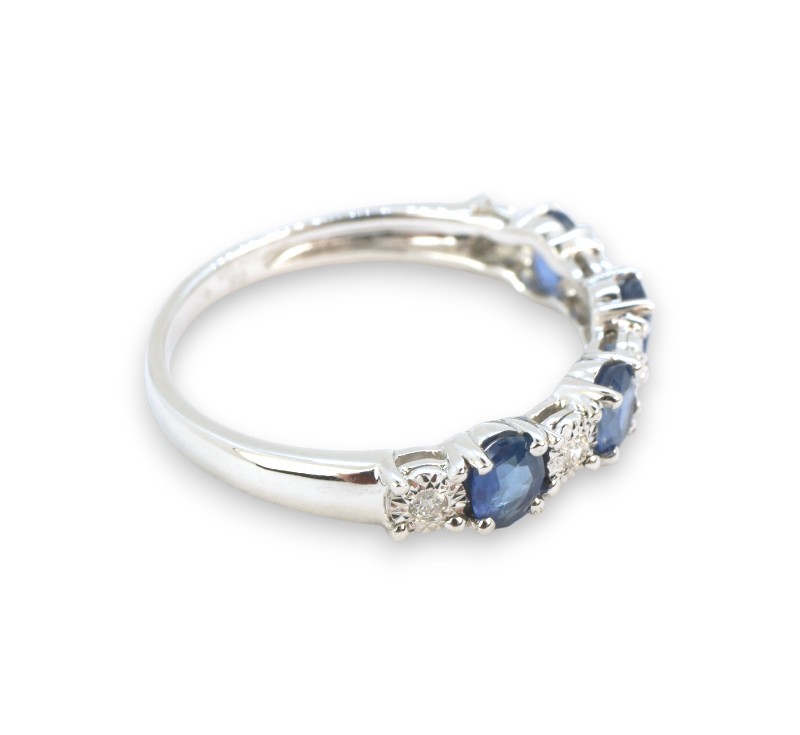 Prsten z bílého zlata ryzosti 585/1000 se safíry o celkové hmotnosti 0,80 ct a diamanty briliantového brusu o celkové hmotnosti 0,05 ct. Celková hmotnost prstenu je 1,95 g. Velikost 53.