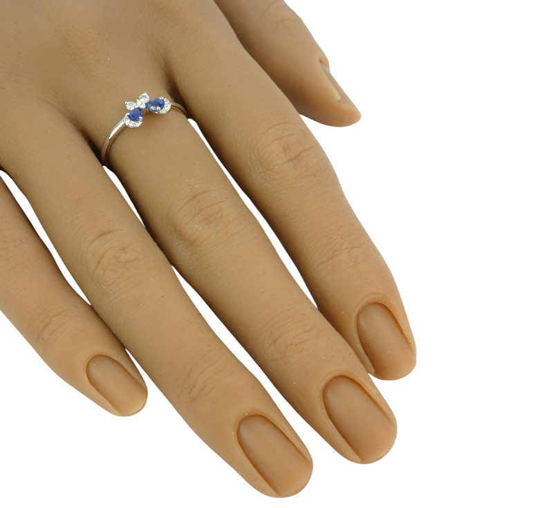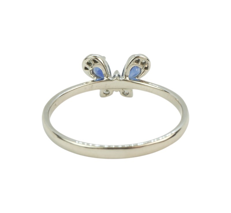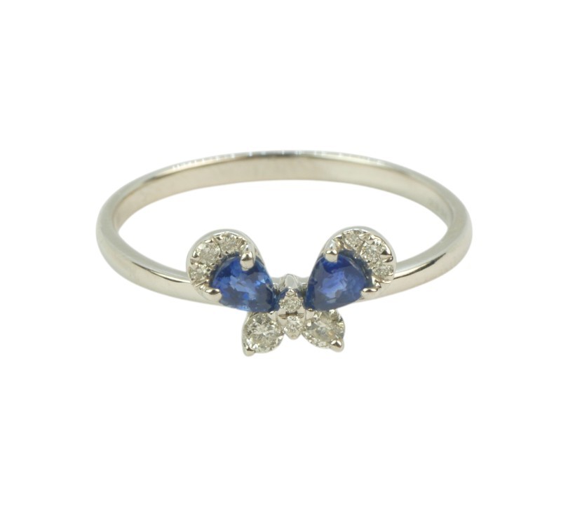 Prsten - motýlek z bílého zlata ryzosti 585/1000 osazený safíry o celkové hmotnosti 0,30 ct a diamanty briliantového brusu o celkové hmotnosti 0,10 ct (SI-PI/H). Celková hmotnost prstenu je 1,59 g. Velikost 56.
