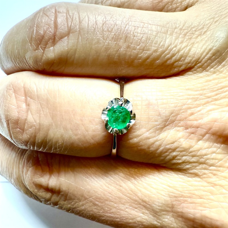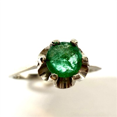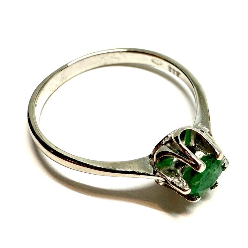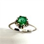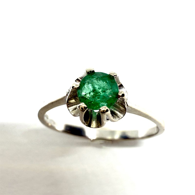 Drobnější, půvabný prsten z bílého zlata. Šperk zdobí sytě zelený, přírodní smaragd, pomocí 6ti krapen zasazený na střed květu. Zlato ryzosti 333/1000, celková váha 1,34 g. Velikost 53. Výborný stav.