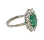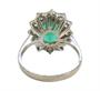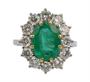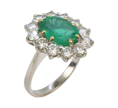 Prsten z bílého zlata ryzost 750/1000, osazený krásným oválným fazetovaným přírodním smaragdem o hmotnosti 2,3 ct a dvanácti diamanty briliantového brusu. Celková hmotnost diamantů je 1,32 ct, čistoty VS, barvy F/G. Velikost prstenu je 52, celková hmotnost 4,55 g. Atest puncovního úřadu.