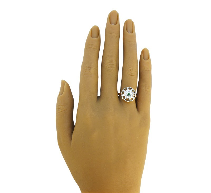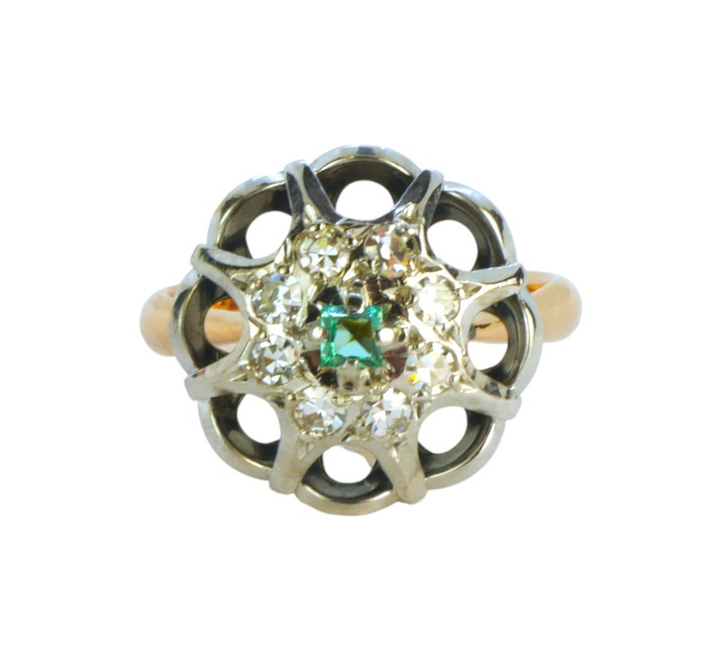 Prsten vyrobený z bílého a růžového zlata ryzosti 585/1000 (punc labuť) zdobený centrálním smaragdem a diamanty. Celková hmotnost 4,72 g. Rozměry hlavy 1,5 x 1,5 cm. Velikost prstenu 53