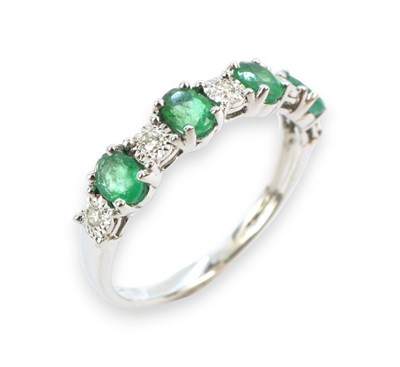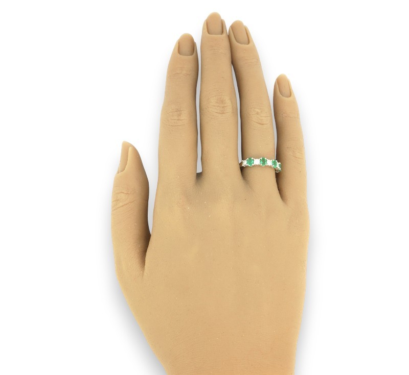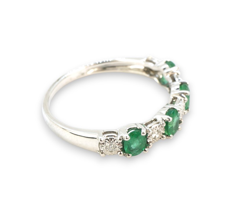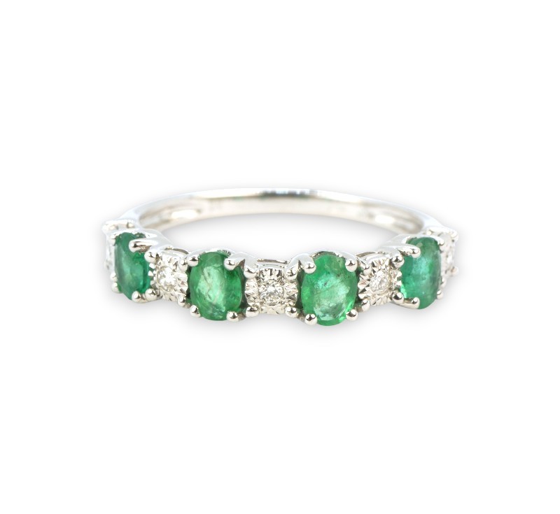 Prsten z bílého zlata ryzosti 585/1000 se smaragdy o celkové hmotnosti 0,60 ct a diamanty briliantového brusu o celkové hmotnosti 0,05 ct. Celková hmotnost prstenu je 1,93 g. Velikost 53.