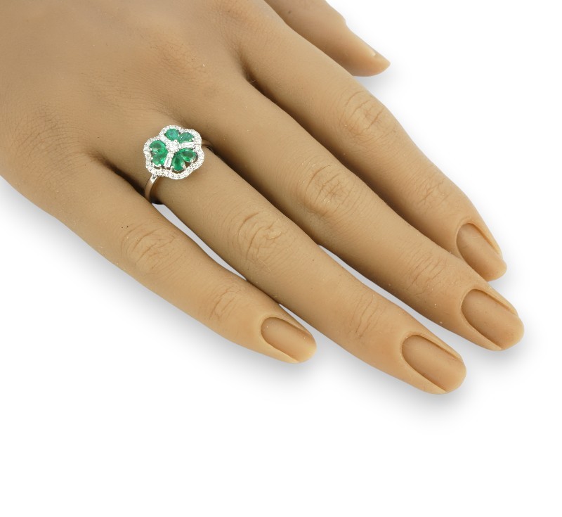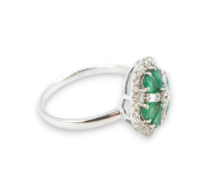 Prsten z bílého zlata ryzosti 585/1000 osazený sytě zelenými přírodními smaragdy o celkové hmotnosti 0,70 ct a diamanty briliantového a bagetového brusu o celkové hmotnosti 0,35 ct . Celková hmotnost prstenu je 2,32 g. Velikost 56.