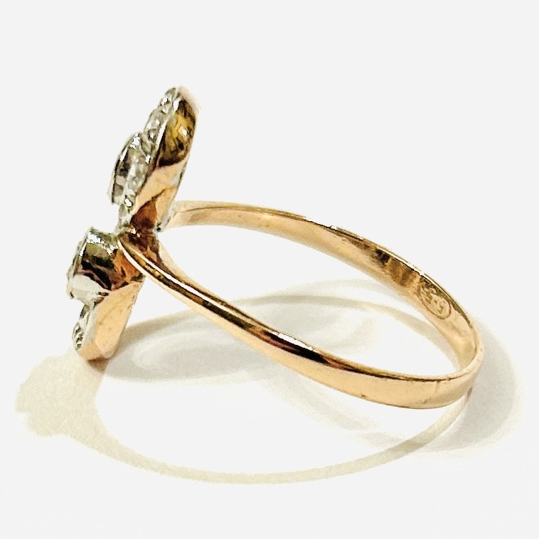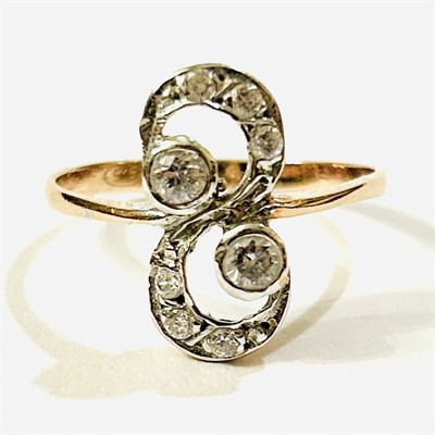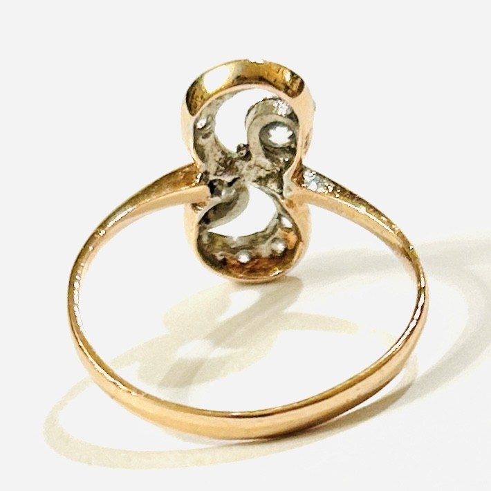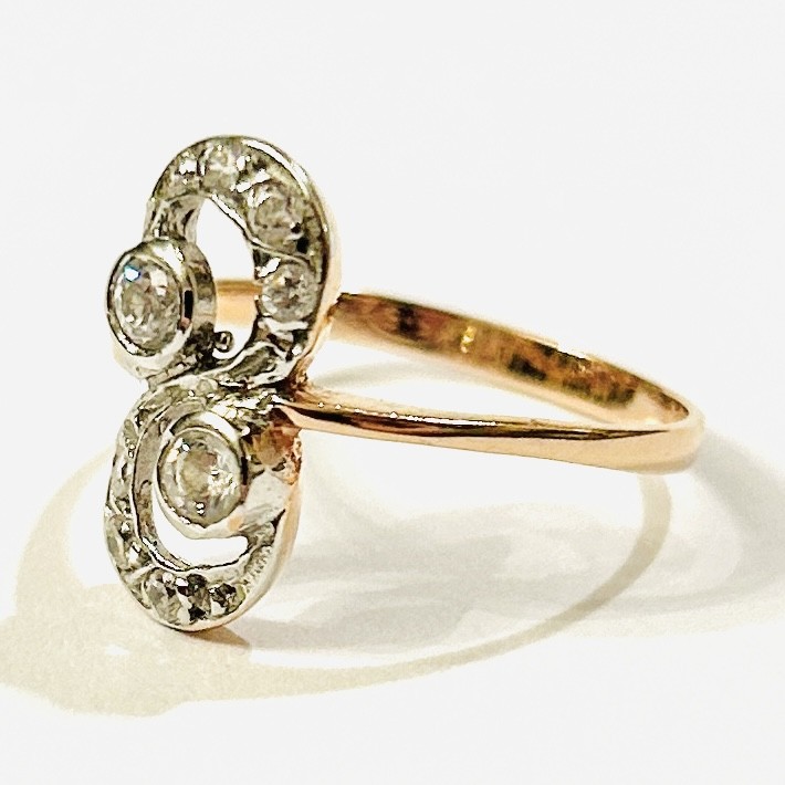 Půvabný, jemný prsten zhotovený patrně dle dobové secesní předlohy. Atypická hlavice ve tvaru "8" pletence tvořena dynamicky se rozšiřujícími křivkami, zvýrazněno 2 většími kameny, osázeno přírodními diamanty kulatého briliantového a jednoduchého brusu o celkové váze 0,24 ct (8 ks), uloženo v lůžkách z bílého zlata. Západoevropská práce z konce 20. století. Zhotoveno z narůžovělého žlutého 14 karátového zlata, tj. o ryzosti 585/1000; nově opatřeno puncem Z-58 (labuť 4) a ryzostní číslo zevnitř šíny. Hmotnost 2,22 g, velikost 58, délka hlavice 58, šířka 5,5 mm. V zachovalém stavu, odborně vyčištěno a vyleštěno zlatníkem.