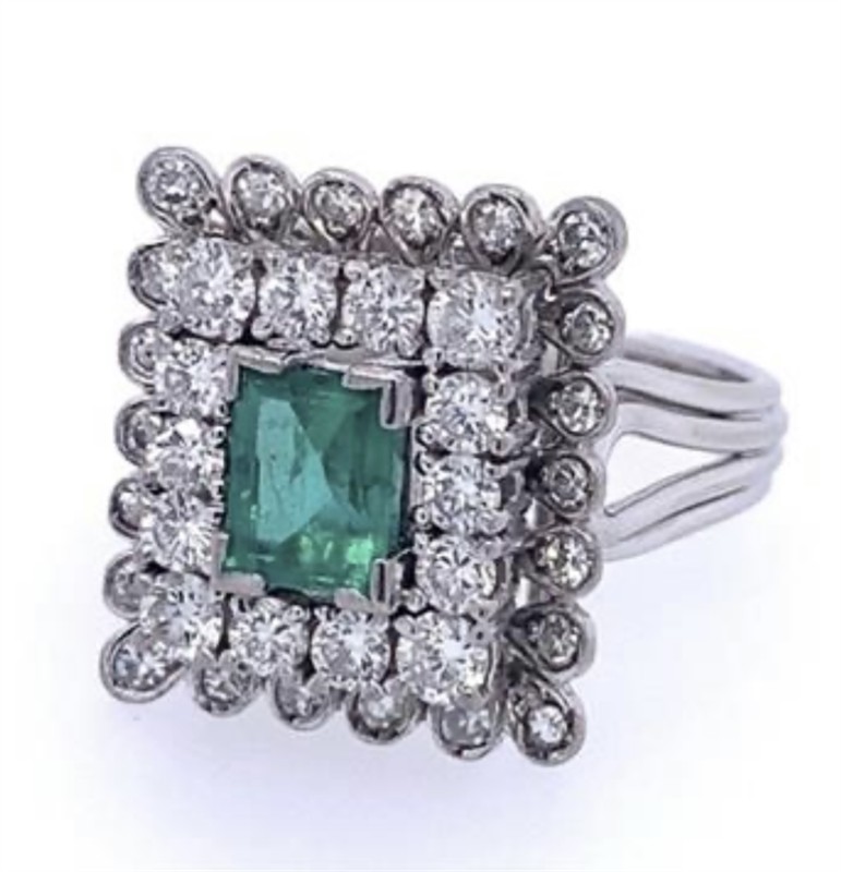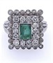 Zlatý reprezentativní prsten s brilianty a smaragdem o váze cca 0,80ct obdélníkového brusu a 22ks diamantů o celkové váze celkem cca 1,20ct.., Vel. 56 , bíle 18 karátové zlato 750 / 1000, hmotnost 7,50 g, velikost hlavy prstenu 1,6cm /1,5 cm , Nádherná barva smaragdu a briliantů, Odborně vyčištěna zlatníkem