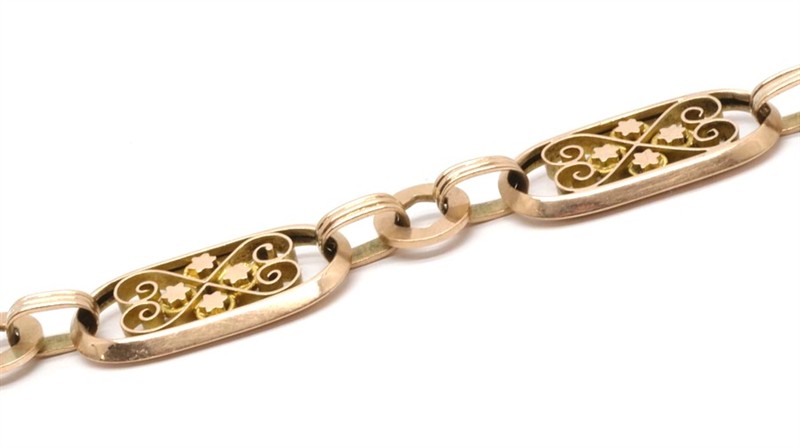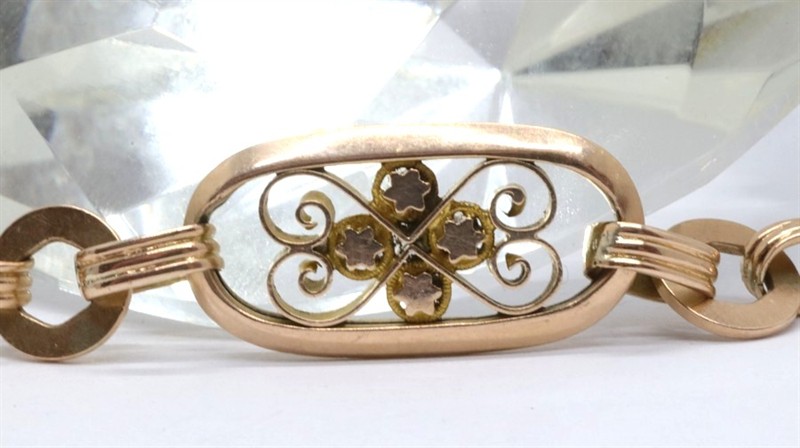 Zlatý řetízek ke kapesním hodinkám. Žluté zlato 580/1000 (puncovní značka "liška"). Váha řetízku: 30,13 g. Délka řetízku: 34 cm.