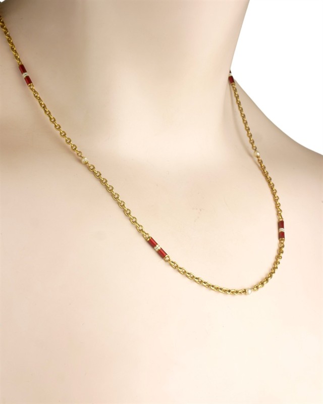 Starožitný zlatý řetízek se smaltem a perličkami, 14 karátové žluté zlato 585 / 1000, celková váha 8,03 g ,platný punc – čejka, Celková délka je 56 cm.