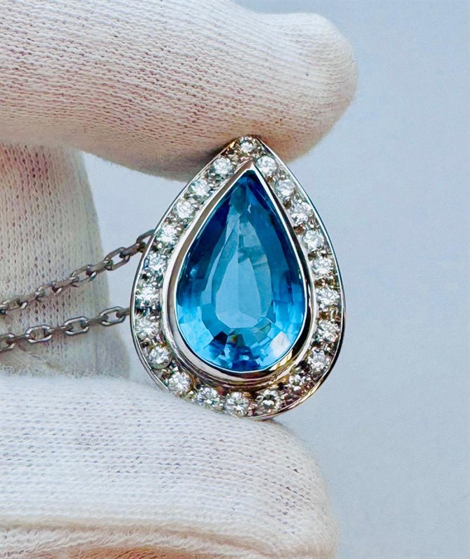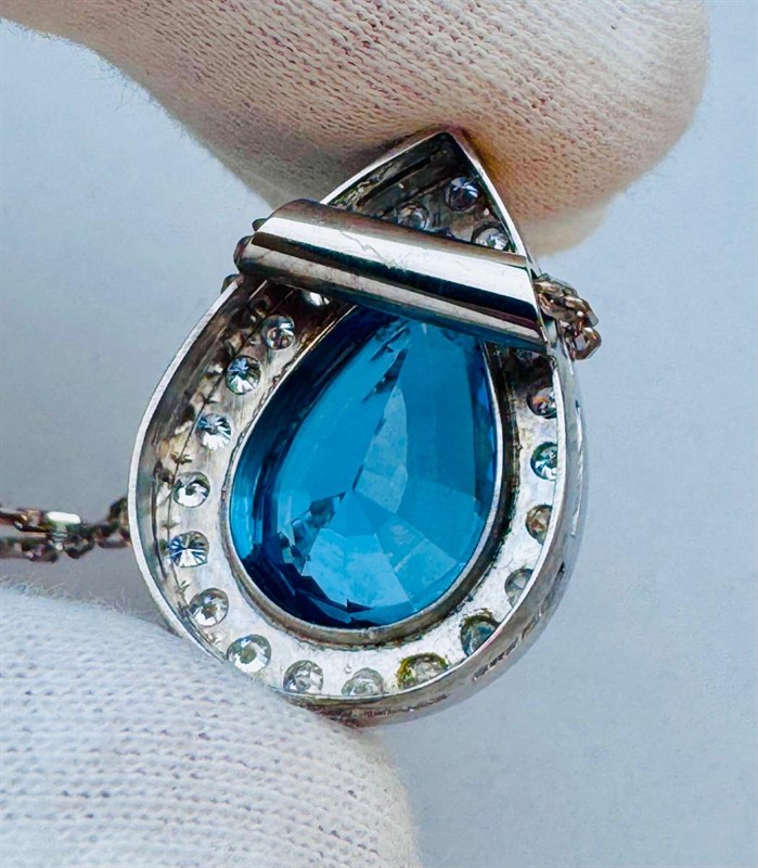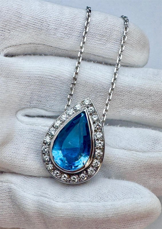 Zlatý řetízek s příveskem s topazem a diamanty, přívěsek je osazený přírodním topazem o váze cca. 5,00ct. - velikost 19x11,5 mm a dále je fasováno 22 diamantů, briliantů o váze cca. 1,10ct. G/VSI. Přívěsek je vyrobený ze zlata 750/1000 o váze 11,0 gramů. Řetízek je vyrobený ze zlata 585/1000 o váze 5,2 gramů, řetízek má délku 43 cm. Velikost přívěsku je 28x20mm. Přívěsek je výrazný a jistě bude okouzlující doplňkem každé úspěšné ženy.