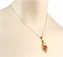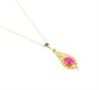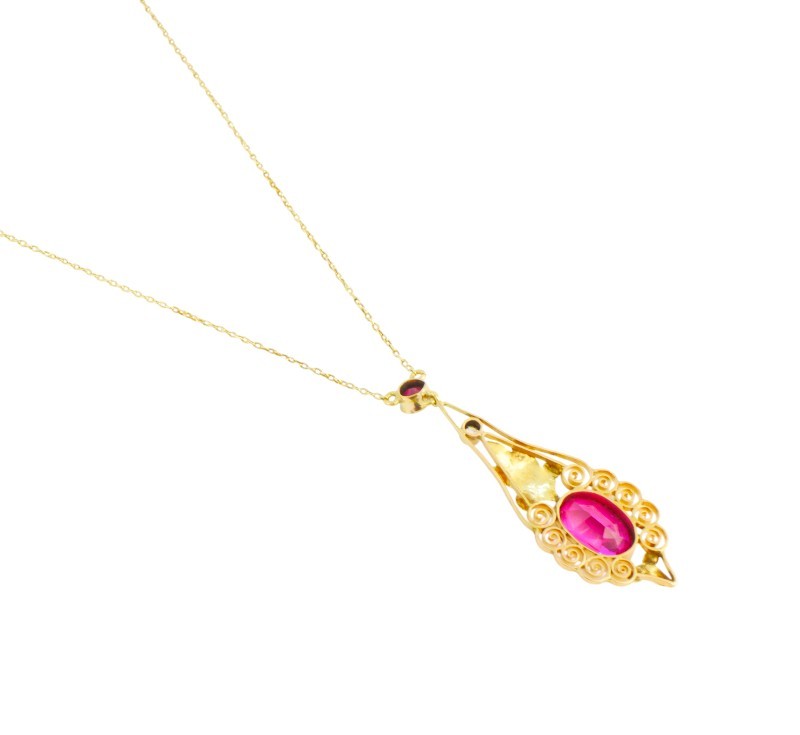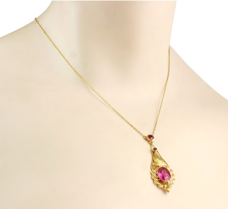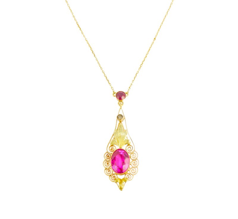 Secesní kolier ze žlutého zlata zdobí dva sytě růžové syntetické spinely zasazené do velmi jemých obrub a jeden drobný růžový kamínek. Zlato ryzosti 585/1000, prvorepublikový punc lvíček. Délka závěsu cca 4,5 g, délka řetízku 40 cm. Celková hmotnosti 4,20 g. Náhrdelník vyniká svou lehkostí a typickou secesní ornamentikou.
