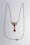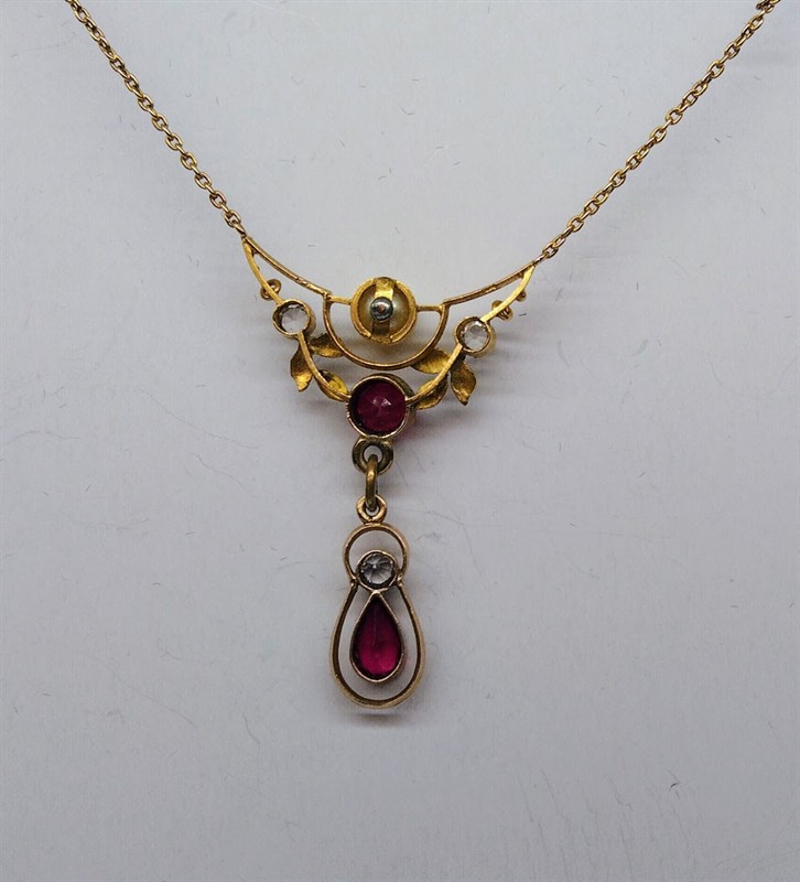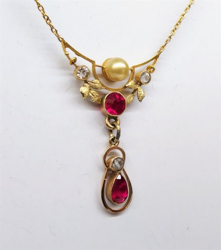 Zlatý pozdně secesní náhrdelník s perlou, syntetickými rubíny a leukosafíry. Celková hmotnost 3,36 g, Au 580/1000, punc čejka (Z - 36). Špičková šperkařská práce, Republika Československá, druhá čtvrtina 20. století. Délka závěsu 3,5 cm, šířka 2,3 cm, délka řetízku 39 cm.