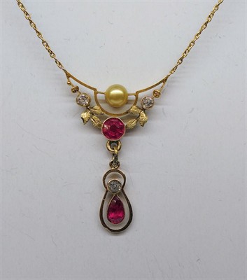 Zlatý secesní náhrdelník s perlou, rubíny a leukosafíry