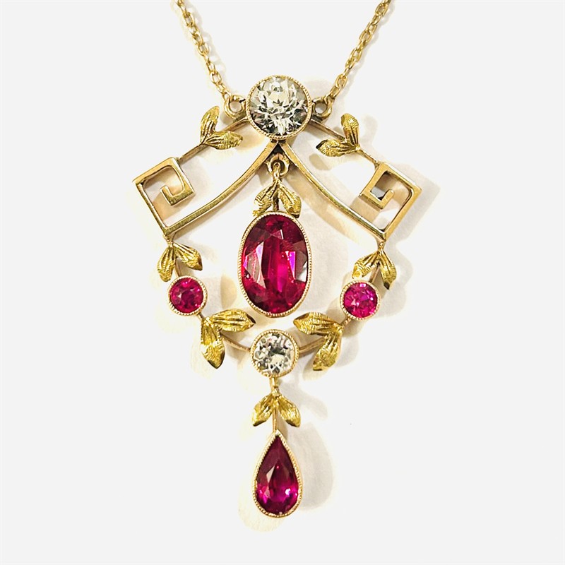 Velmi půvabný koliér z období pozdní secese, tělo větší ozdoby tvořeno dvěma zahraněnými volutami z nich je spuštěn feston, četně zdobeno jemně rytými lístečky. Osazeno syntetickými rubíny kulatého, oválného a kapkového brusu, doplněno o dva přírodní leukosafíry kulatého brusu o celkové váze cc 0,90 ct, fasováno v zrnitých obrubách. Kompoziční proporce nevšedně zvýrazněna 2 většími kameny v kontrastu s menšími, oživeno 2 kinetickými ověsky. Pražská klenotnická práce z přelomu 10. a 20. let 20. století. Zhotoveno z narůžovělého žlutého 14 karátového zlata, tj. o ryzosti 580/1000; československý punc Z-36 (čejka 4) a mistrovská značka u zapínání. Celková hmotnost 6,19 g, celková délka 44 cm, šířka vazby 1 mm, délka ozdoby 39,5 mm, šířka 27 mm. Zapínání formou pérového kroužku v funkční (je tužší na otevření), ponecháno s jemnou přirozenou patinou, lze vyčistit, celkově ve velmi zachovalém stavu.