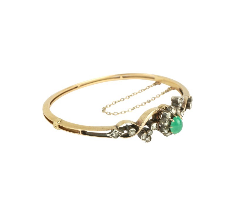 Elegantní, dekorativní otevírací náramek z období secese, hlavice ze splétaných křivek inspirovaných florální říší, uprostřed osazeno oválnou muglí přírodního smaragdu o váze 1,00 ct, jež je dobré kvality, rámováno a dále doplněno o přírodní diamanty routového brusu o celkové váze 0,60 ct (21 ks), jejichž kvalita je dobrá až střední. Spodní část odlehčena průsvitkami. Západoevropská klenotnická práce z konce 19. století. Zhotoveno z narůžovělého žlutého 14 karátového zlata, tj. o ryzosti 585/1000, kameny uloženy ve stříbře o vysoké ryzosti 980/1000; vyhotoveno osvědčení puncovního úřadu, neznačeno. Hmotnost 16,22 g, vnější délka 64 mm, vnitřní délka 58 mm, šířka hlavice 13 mm. Jazýčkové zapínání včetně pojistného řetízku v pořádku. Ponecháno s přirozenou patinou, lze vyčistit, celkově ve velmi zachovalém stavu. Součástí odborný posudek.