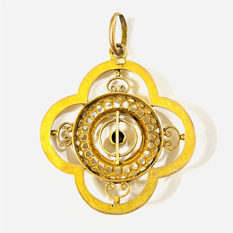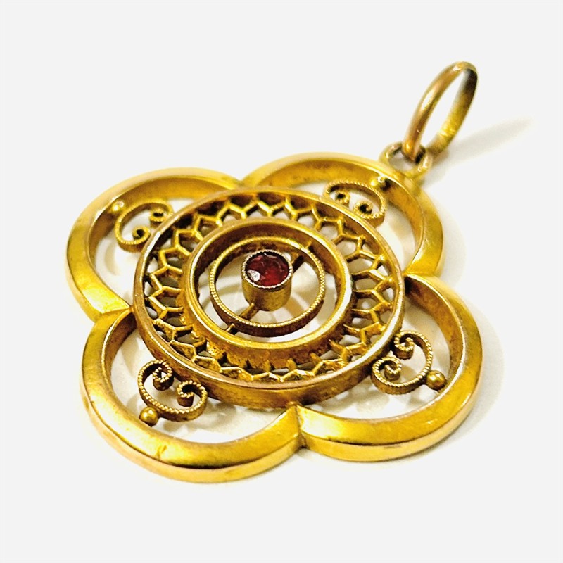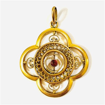 Půvabný, raně secesní větší přívěšek tvaru čtyřlístku, bohatě ornamentální prolamovaná výplň uprostřed osazena rubínovým sklem kulatého brusu. Kvalitní německá zlatnická práce z konce 19. století. Vyrobeno technikou dutého kovu. Zhotoveno z narůžovělého žlutého 8 karátového zlata, tj. o ryzosti 333/1000; vyhotoveno osvědčení puncovního úřadu, ryzostní číslo zezadu. Hmotnost 2,75 g, celková délka 43 mm, šířka 37 mm. Ponecháno s přirozenou patinou, lze vyčistit, kámen podřený (není téměř patrné), celkově v zachovalém stavu.