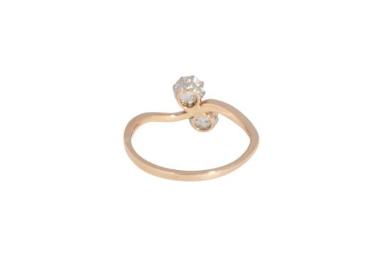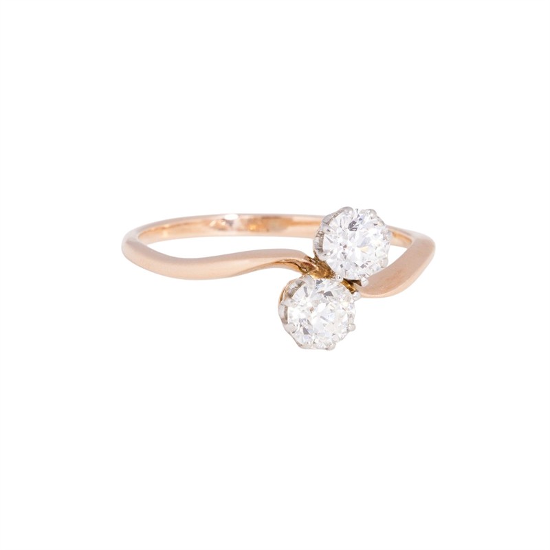 Půvabný zlatý prsten z období secese, je osazený dvěma přírodními diamanty starého briliantového brusu o celkové hmotnosti 0,90 ct, zlato o ryzosti 395/1000 o celkové hmotnosti 2,46 g, Atest Puncovního úřadu velikost prstenu: 60