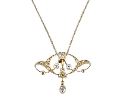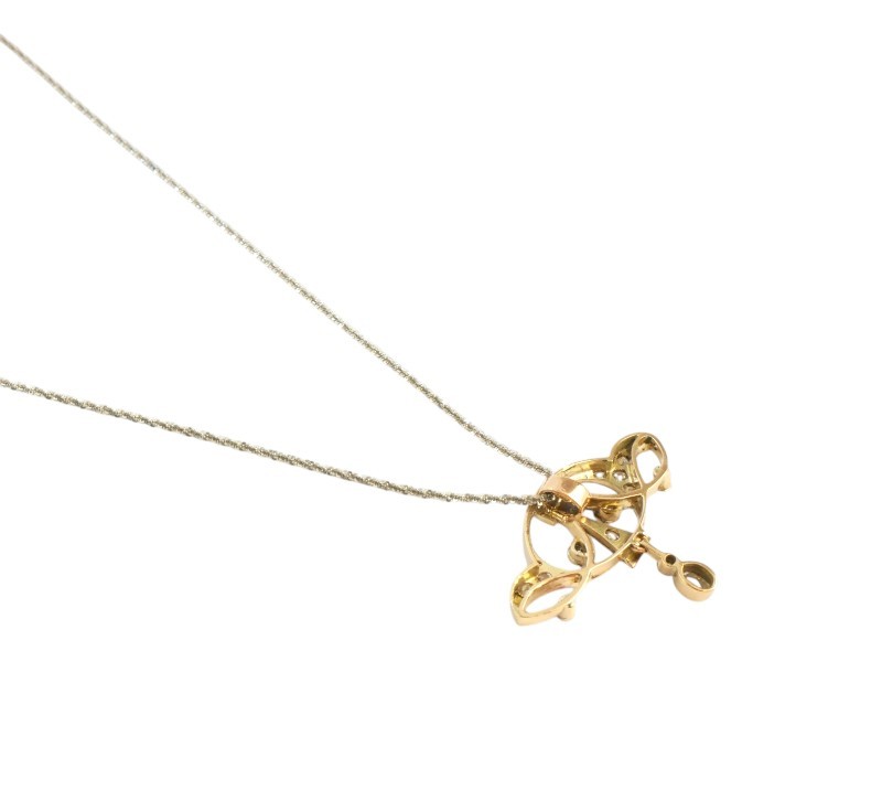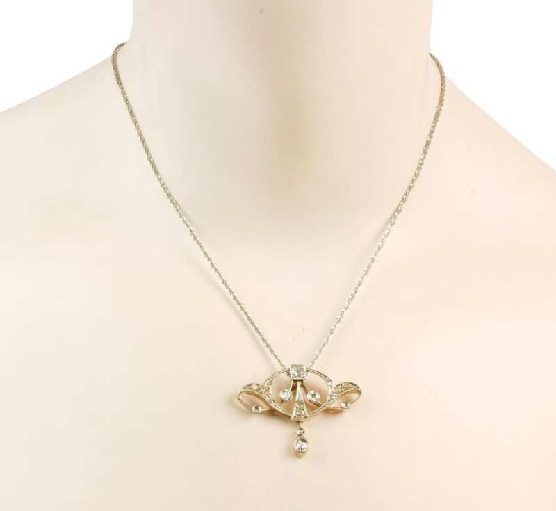 Zlatý secesní závěs s brilianty, krásná původní práce -Čechy 1900 ,Au 500/1000, hmotnost 5,25g, velikost 35x25mm, diamanty o celkové váze cca 0,95ct., stříbrný řetízek délka cca 45 cm ,atest punc.úřadu