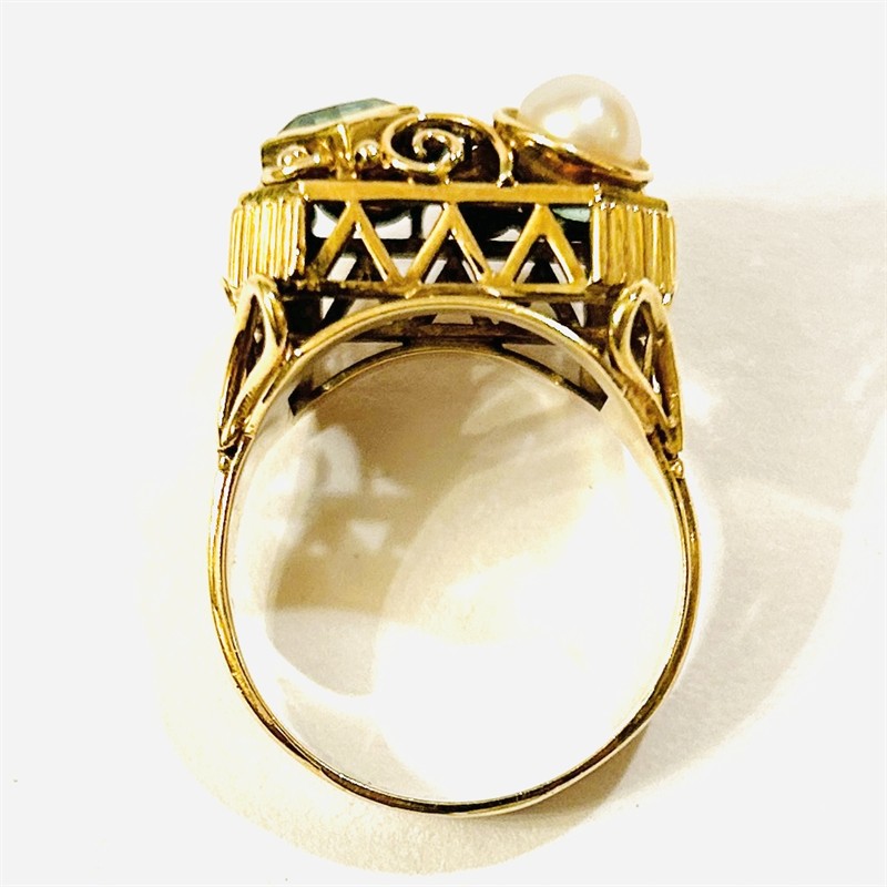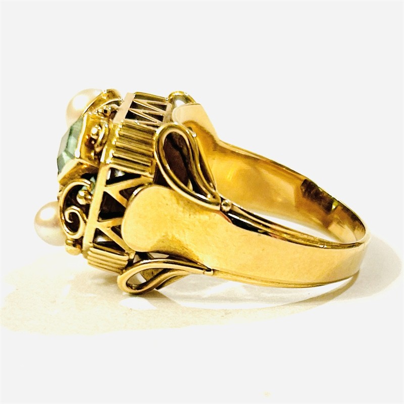 Extravagantní, dekorativní prsten koktejlového typu z období art-deco, osazeno 2 přírodními zelenými turmalíny kulatého a čtvercového brusu fasovaných v plně přiléhajících obrubách, doplněno o 2 různě velké přírodní kultivované narůžovělé bílé perly, které se vyznačují svou vysokou kvalitou. Obdélná vyšší hlavice bohatě prořezávána, čelní strana se stylizovanými florálními ornamenty, boční stěny se zigzag dekorem s nárožními kanelurami. Autorský design blízký Wiener Werkstätte, precizní německá klenotnická práce z 30. až 50. let 20. století. Zhotoveno ze žlutého 14 karátového zlata, tj. o ryzosti 585/1000; vyhotoveno osvědčení puncovního úřadu, ryzostní číslo zevnitř šíny. Hmotnost 9,35 g, velikost 61, délka hlavice 19,5 mm, šířka 15 mm, výška 11 mm. Ve velmi zachovalém stavu, odborně vyčištěno.