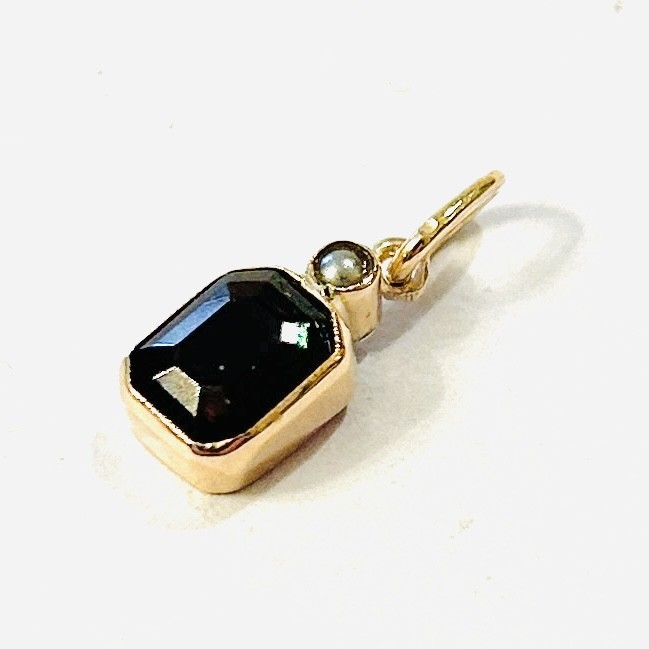 Decentní přívěšek osazený rudým sklem obdélného brusu, doplněno drobnou přírodní šedou perlou, fasováno v zrnitých obrubách. Vídeňská zlatnická práce z počátku 20. století. Zhotoveno z narůžovělého žlutého 14 karátového zlata, tj. o ryzosti 580/1000; rakousko-uherský punc Z-27 (liška 4) s písmenem „A“ (značí vídeňský puncovní úřad) a mistrovská značka "FK" na očku. Hmotnost 0,82 g, celková délka 17 mm, šířka 6 mm. Jedná se o konverzi z náušnice, v zachovalém stavu, odborně vyčištěno a vyleštěno zlatníkem.
